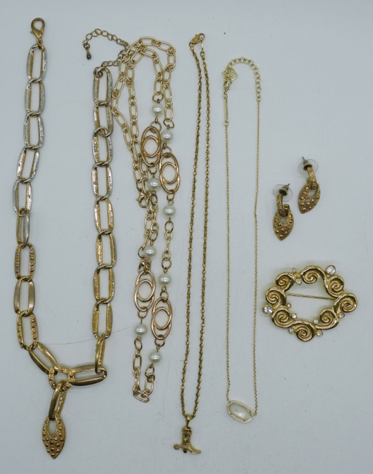 3 NECKLACES, 16″, 18″, 20″. PIERCED EARRINGS. BROOCH 2″. CHAIN WITH CLASPS ON EACH END, 28″.