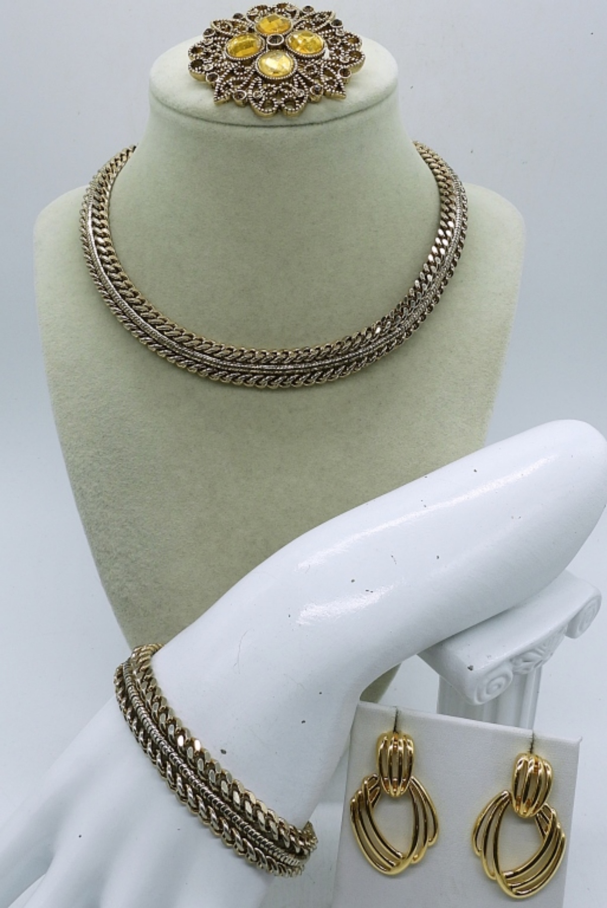 NECKLACE 15″. BRACELET 8″. BROOCH 2″. PIERCED EARRINGS
