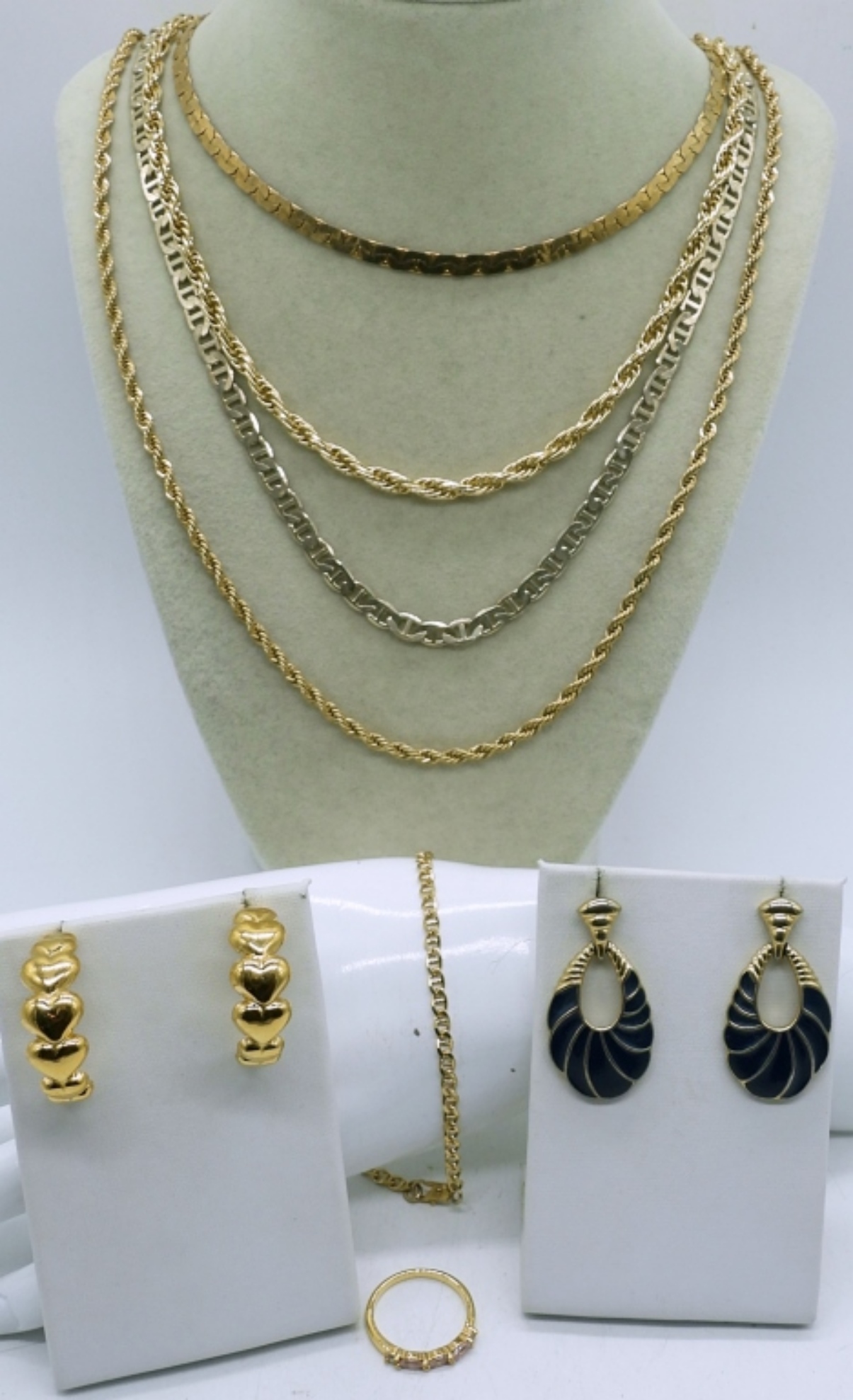 FOUR GOLD TONE CHAINS, 18-28″. RING SIZE 8. BRACELET 8″. 2 PIERCED EARRINGS.