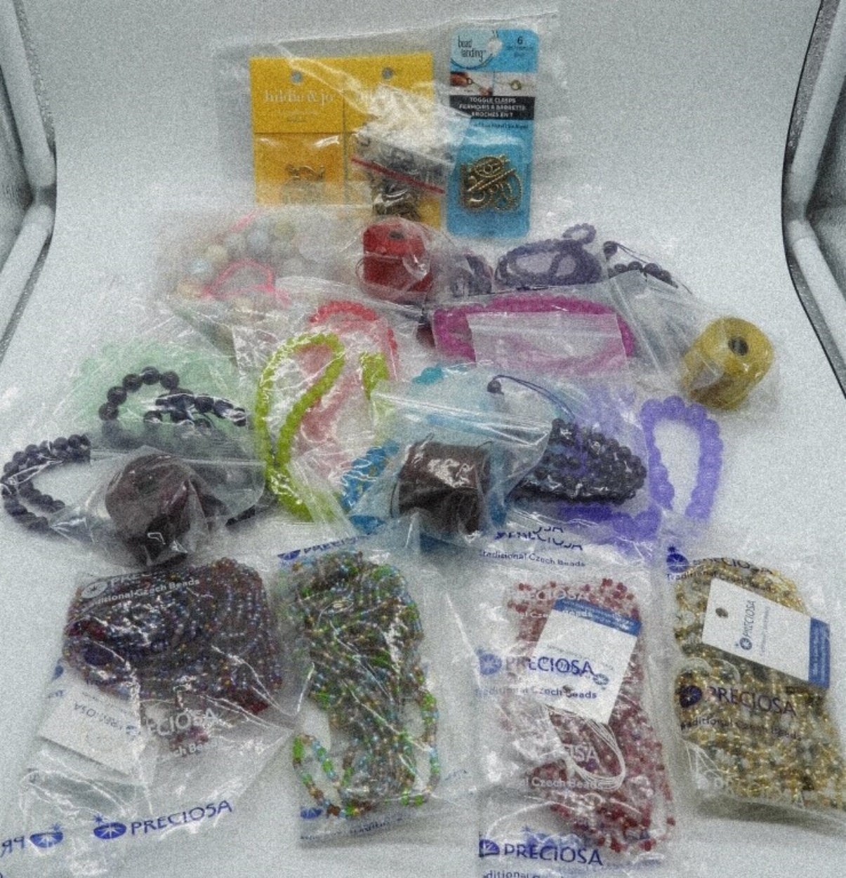 20 BAGS OF BEADS. 4 SPOOLS OF COLORED STRING. 4 PACKAGES OF HARDWARE. SEE PHOTOS