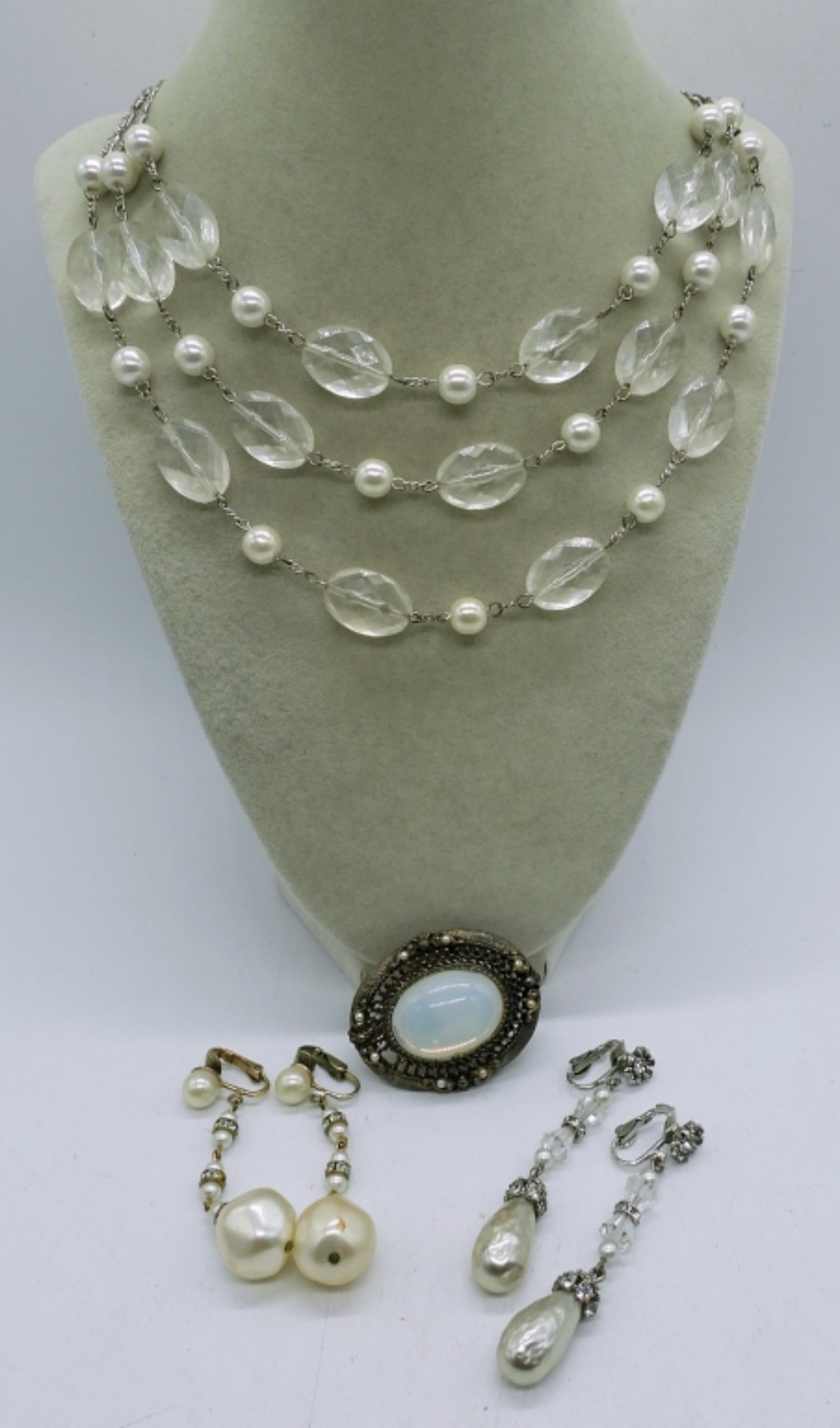 NECKLACE, 20″. TWO PAIR OF CLIP ON EARRINGS. BROOCH, 2″.