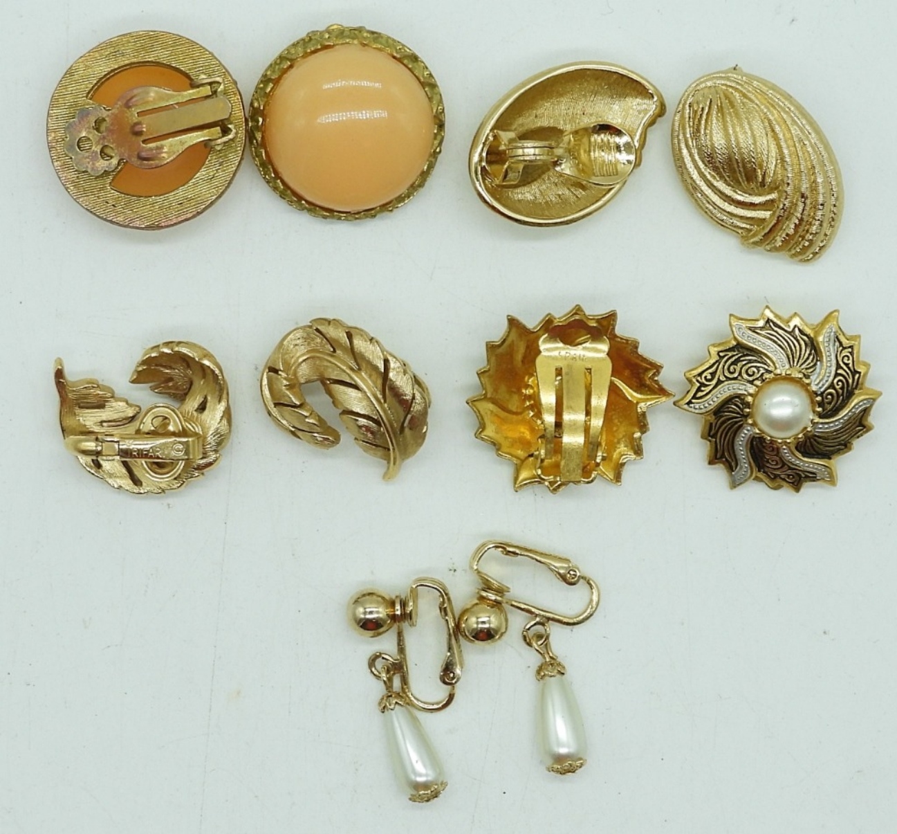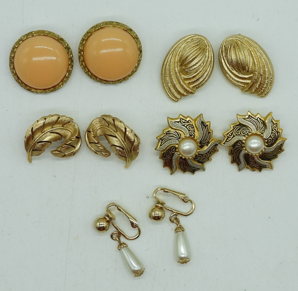 VINTAGE GOLD TONE, CLIP ON EARRINGS. TRIFARI, MONET & SARAH COVENTRY. 5 PAIR-NOT ALL NAME BRAND.
