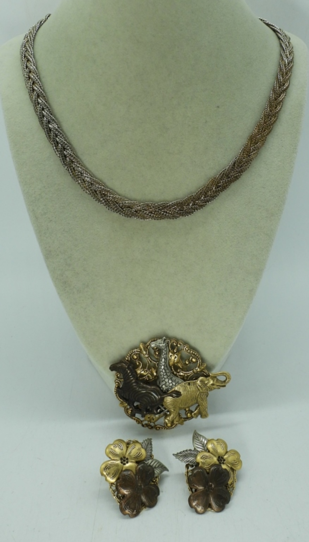BROOCH WITH ZEBRA, GIRAFFE & ELEPHANT, 2.5″. FLORAL PIERCED EARRINGS, 1.5″. BRAIDED CHAIN NECKLACE, 17″.