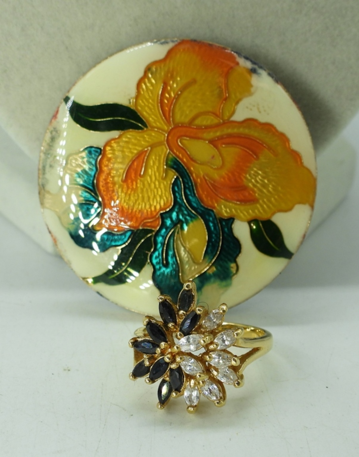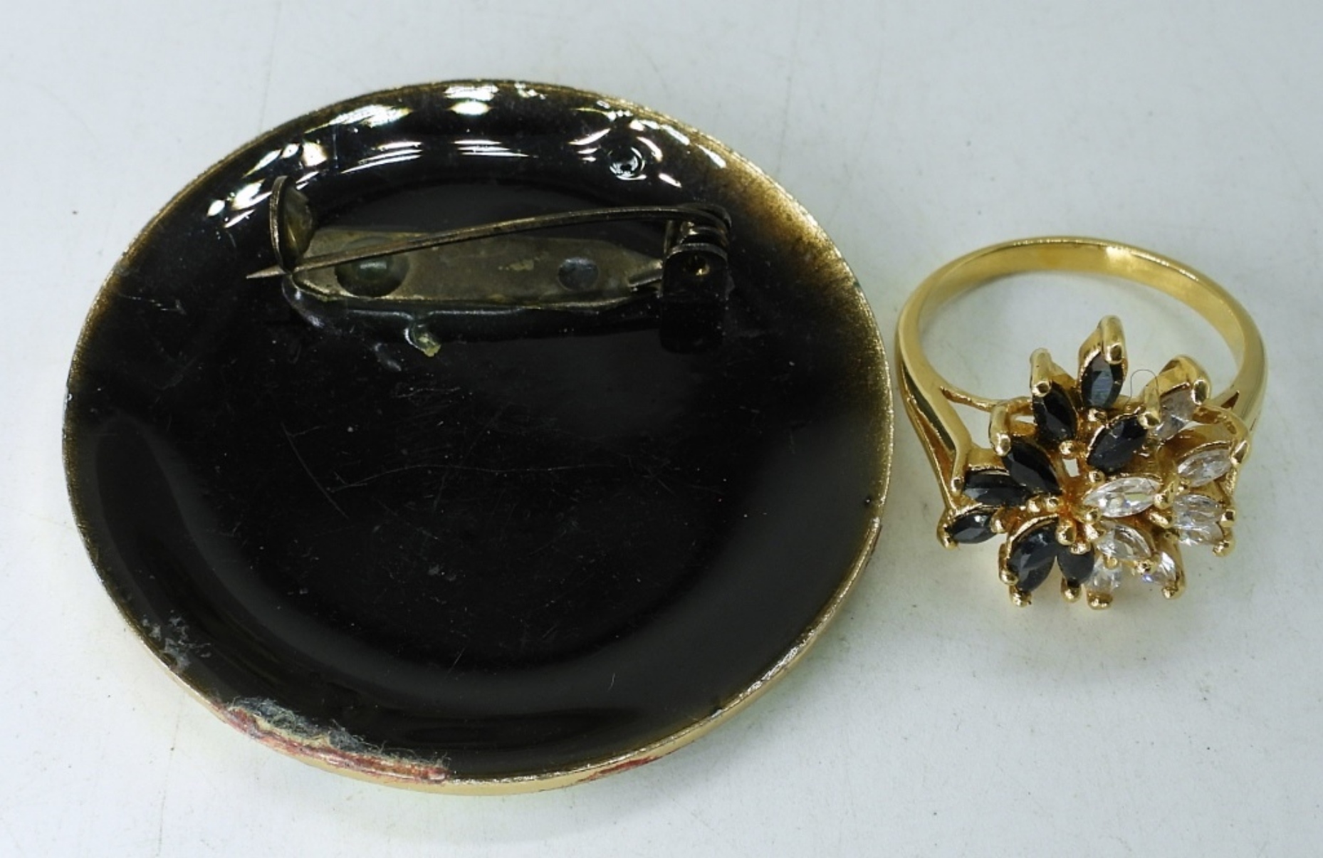 3 LADIES GOLD TONE FASHION NECKLACES SIZE 16″,A SIZE 8 RING WITH BLACK AND DIAMOND LIKE STONES AND A FLOWER BROOCH