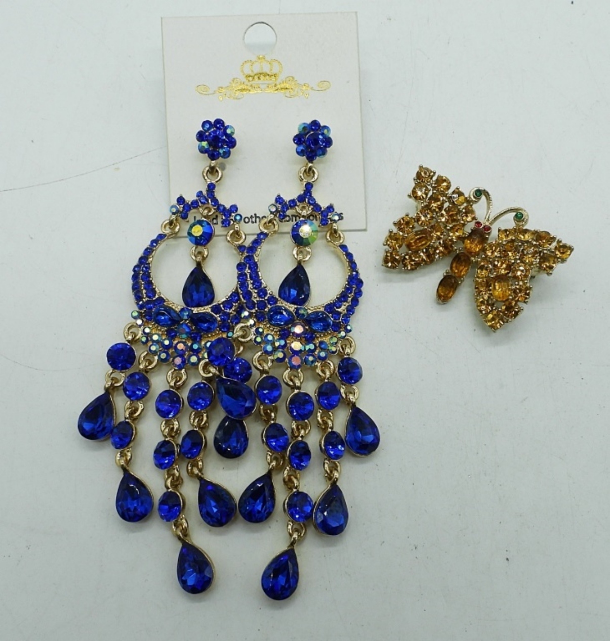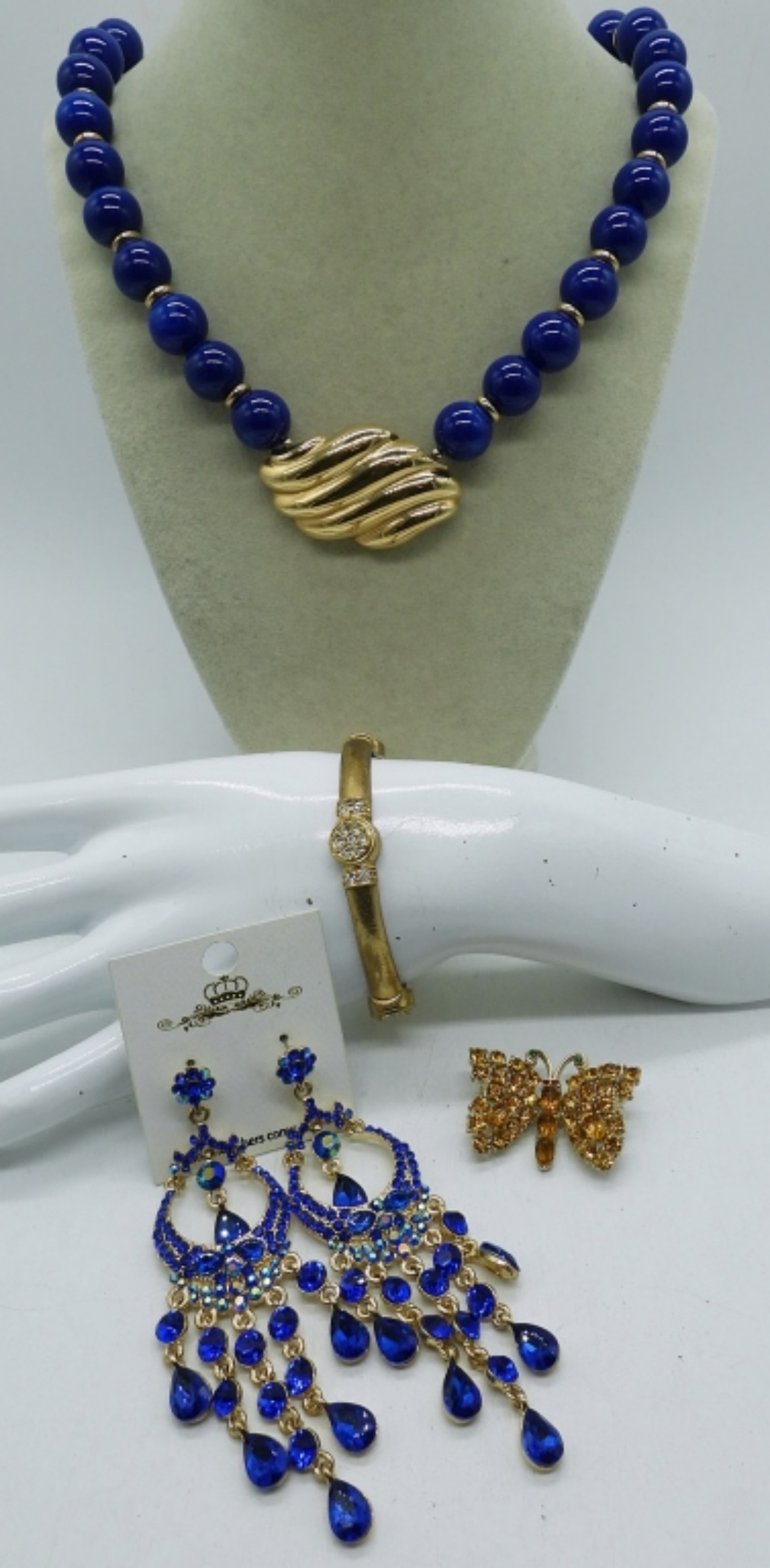 4 PIECE BLUE & GOLD TONE FASHION JEWELRY,22″ GOLD TONE NECKLACE WITH BLUE BEADS, 3″ GOLD TONE RHINESTONE BRACELET, A BUTTERFLY BROOCH AND A PAIR OF GOLD TONE BLUE EARRINGS
