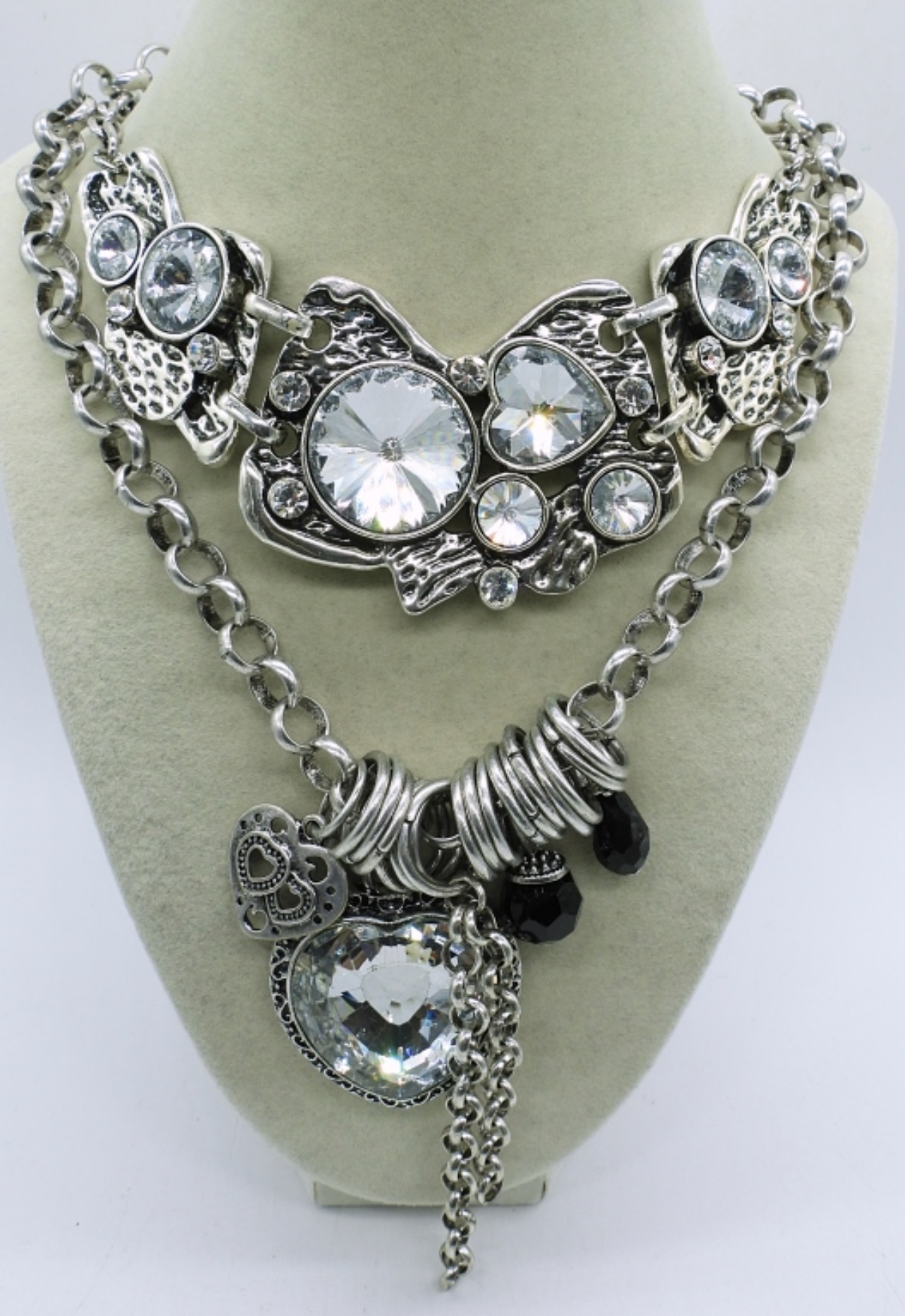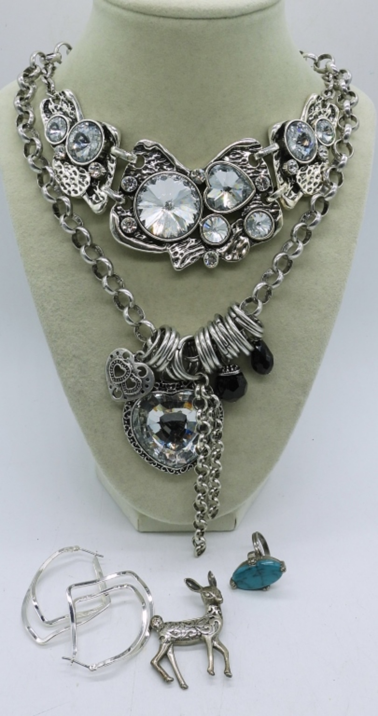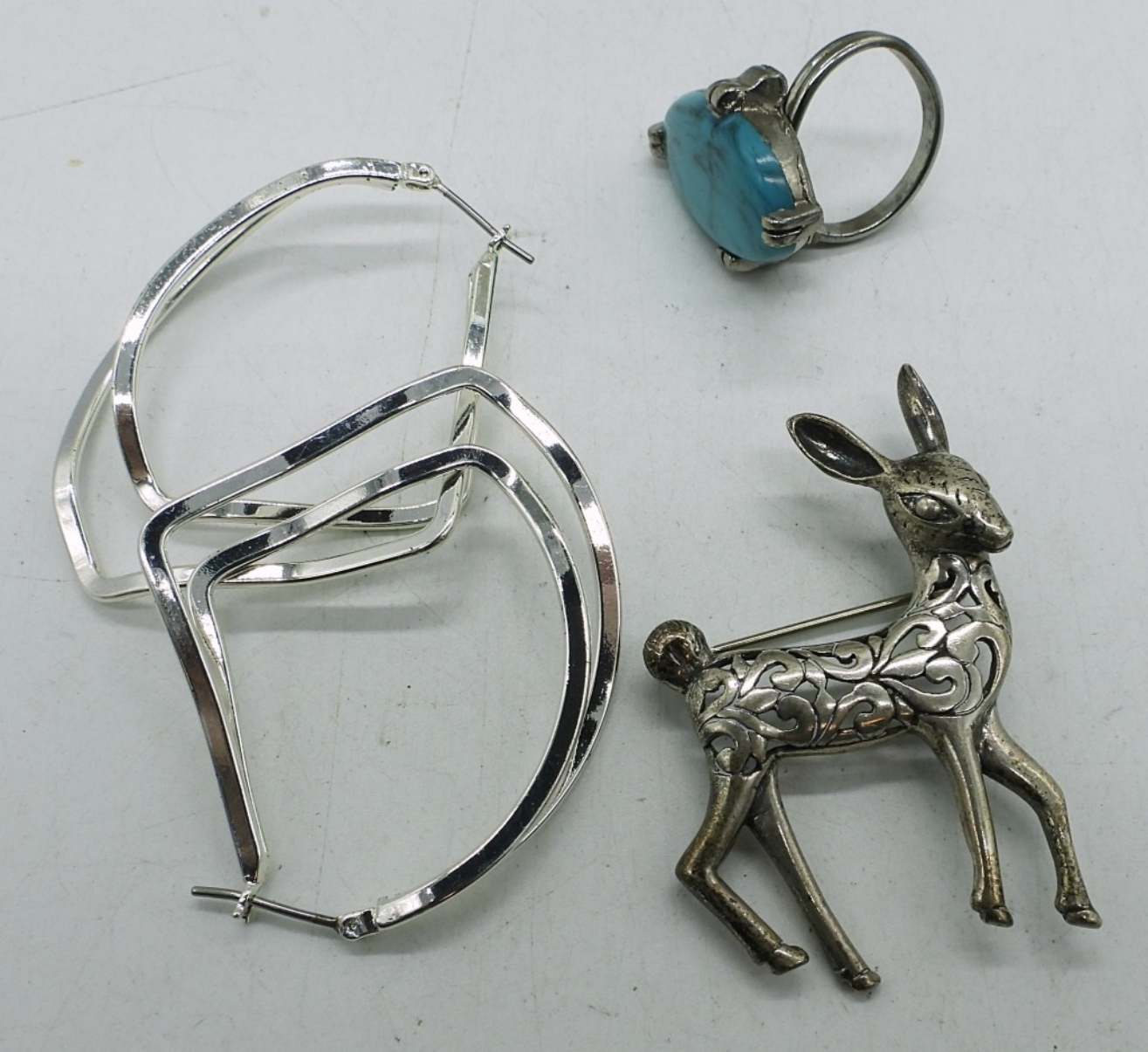 2, 18″ SILVER TONE RHINESTONE NECKLACES, A PAIR OF SILVER TONE EARRINGS, A SILVER TONE BROOCH AND A SIZE 4.5 TURQUOISE -LIKE RING