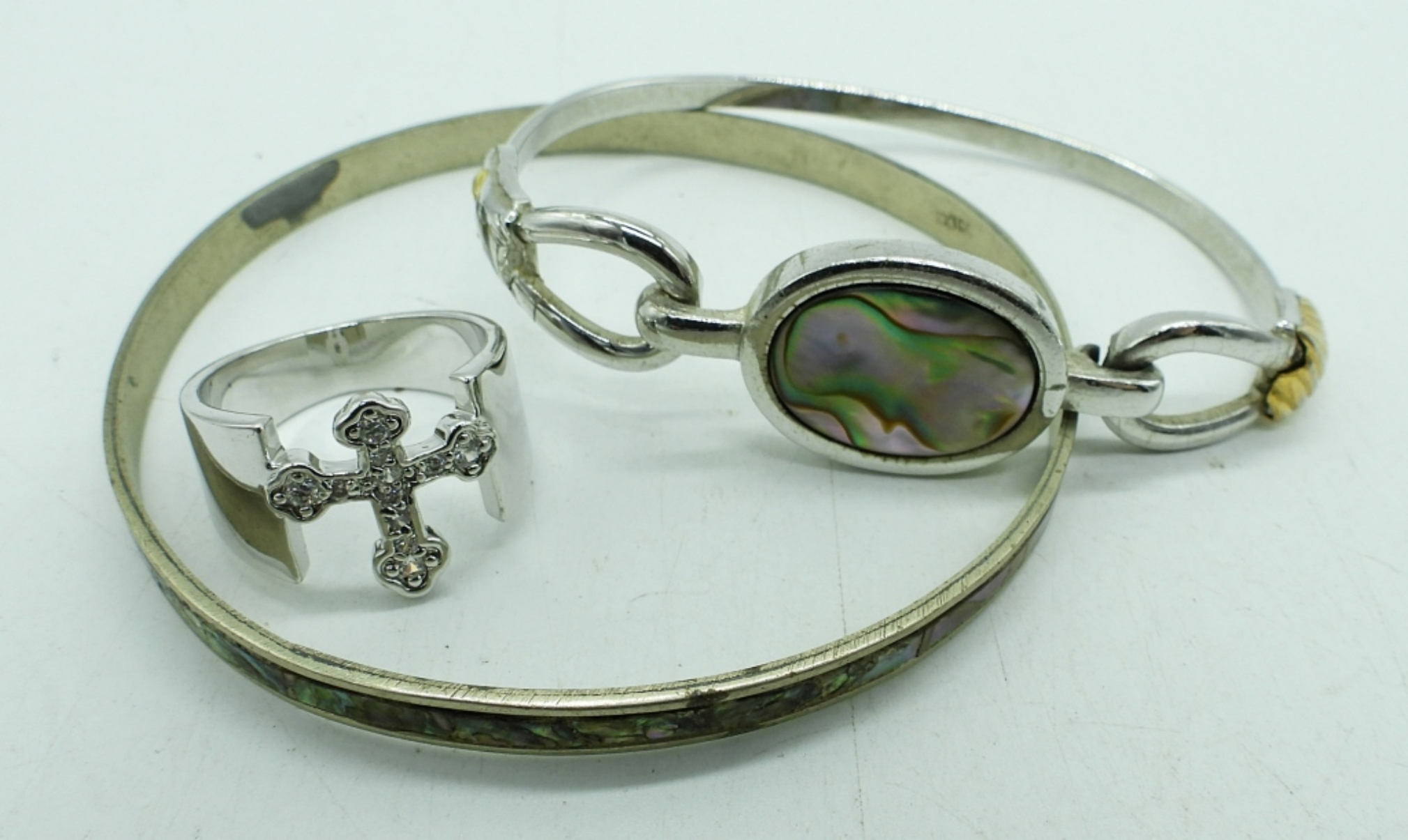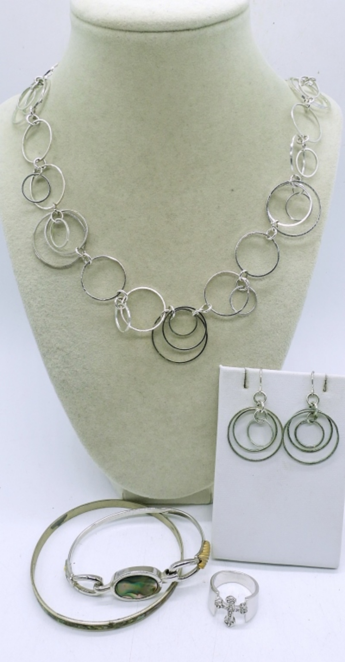 5 PIECE SILVER TONE LADIES JEWELRY,22″ SILVER TONE NECKLACE, 2 SILVER TONE BRACELETS WITH ABALONE INSET , A PAIR OF EARRINGS AND A SIZE 8 RINGS