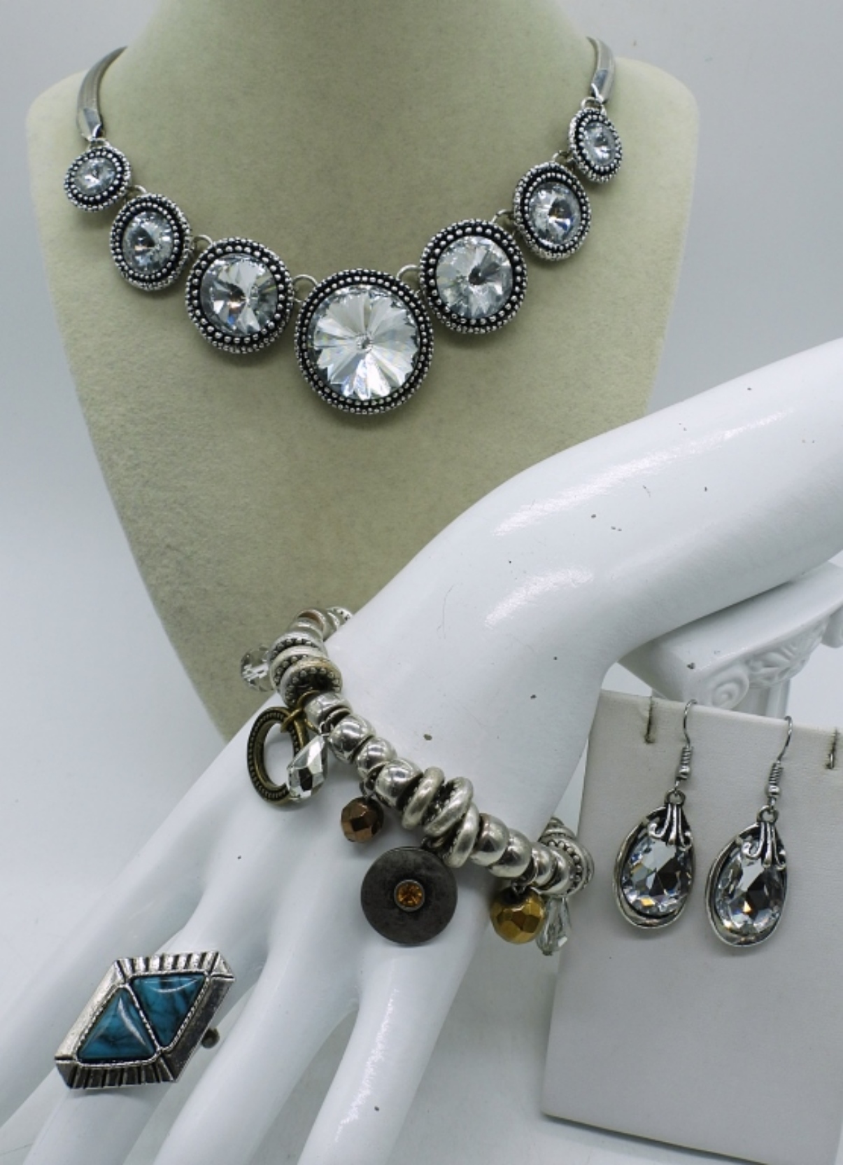 4 PIECE SILVER TONE FASHION JEWELRY SET,18″ SILVER TONE NECKLACE WITH RHINESTONES,3″ SILVER TONE CHARM BRACELET, A PAIR OF SILVER TONE RHINESTONE EARRINGS AND A SIZE 5 SILVER TONE TURQUOISE -LIKE RING