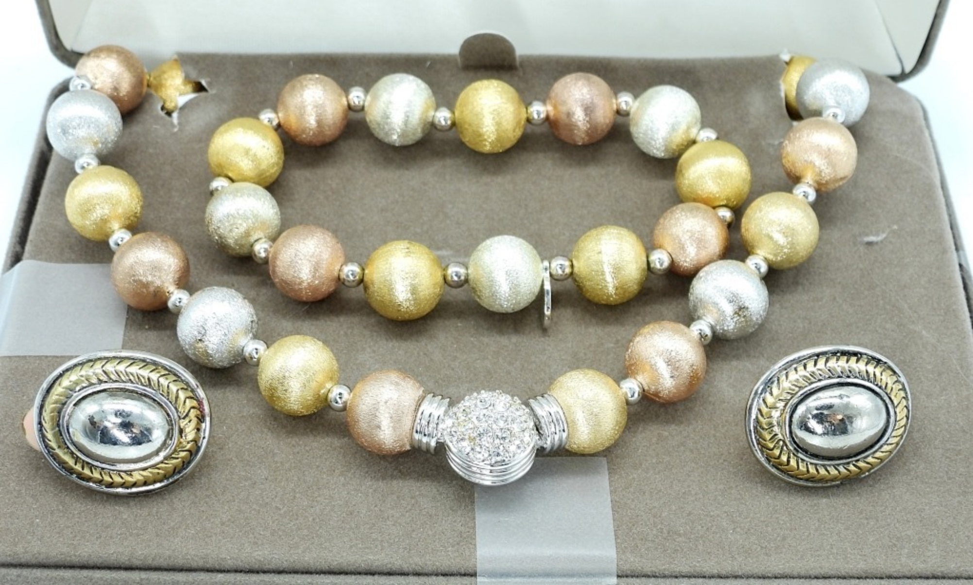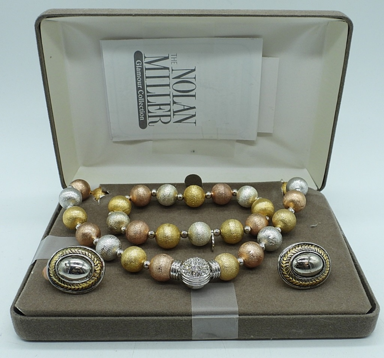 (3) PIECE NOLAN MILLER GLAMOUR COLLECTION, 18″ 3 TONE NECKLACE WITH MATCHING 3″ BRACELET AND A PAIR OF EARRINGS IN A VELVET CASE