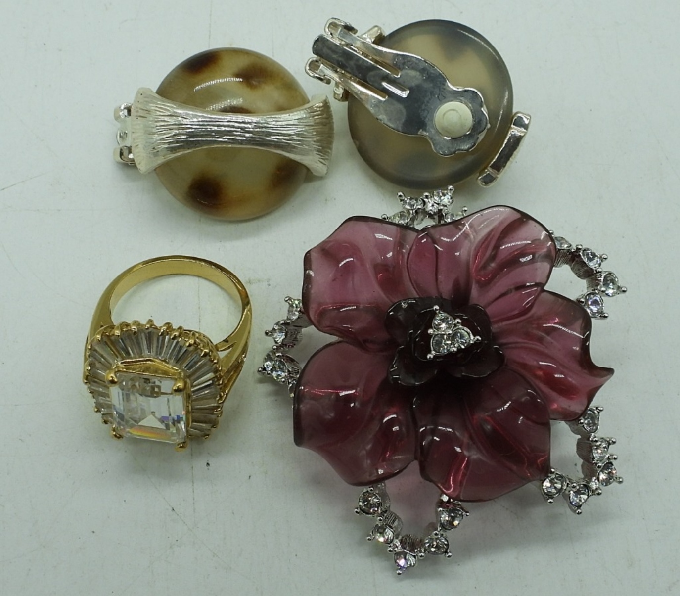 5 PIECE LADIES FASHION JEWELRY SET,36″ GOLD TONE BEADED NECKLACE, 3.5″ GOLD TONE BRACELET WITH RHINESTONES, A PAIR OF EARRINGS , A SIZE 6.5 GOLD TONE DIAMOND -LIKE RING AND A PURPLE FLOWER BROOCH