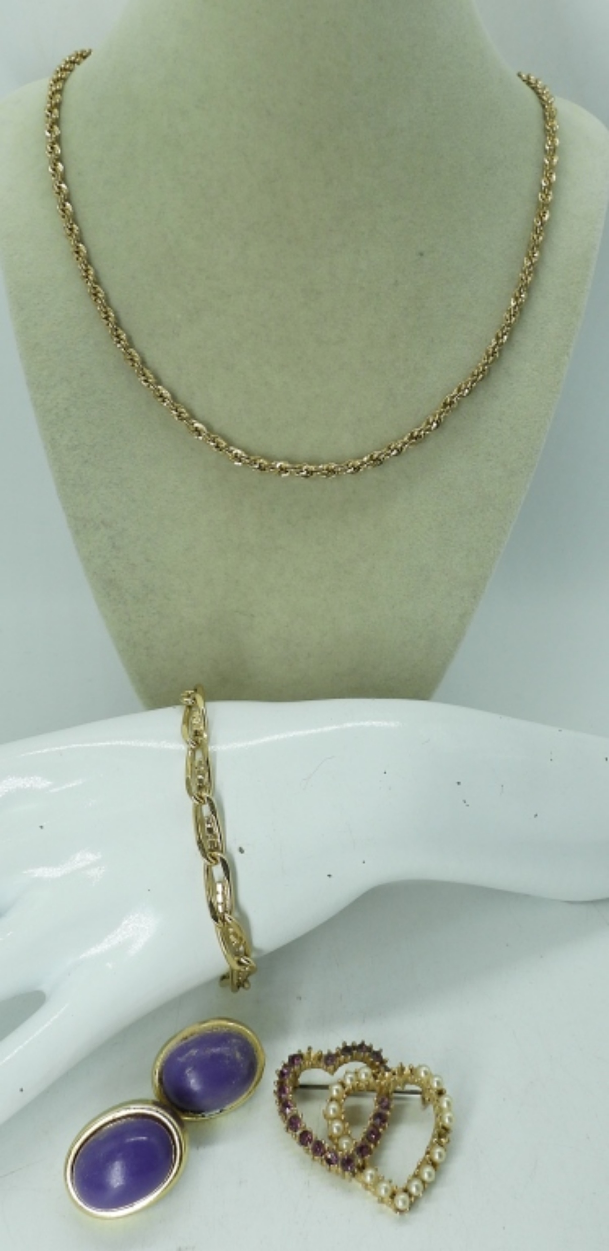 4 PIECE GOLD TONE FASHION JEWELRY,18″ GOLD TONE NECKLACE A 4″ GOLD TONE BRACELET WITH RHINE STONES, A PAIR OF EARRINGS AND A GOLD TONE HEART BROOCH