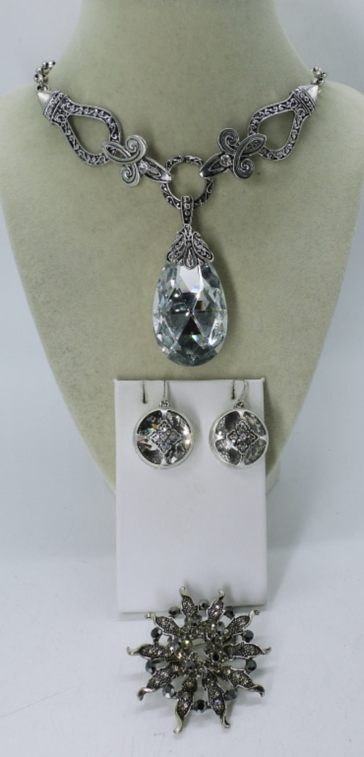 3 PIECE SILVER TONE LADIES JEWELRY,40″ SILVER TONE NECKALCE WITH A CRYSTAL PENDANT, A PAIR OF EARRINGS AND A SILVER TONE BROOCH WITH RHINESTONES