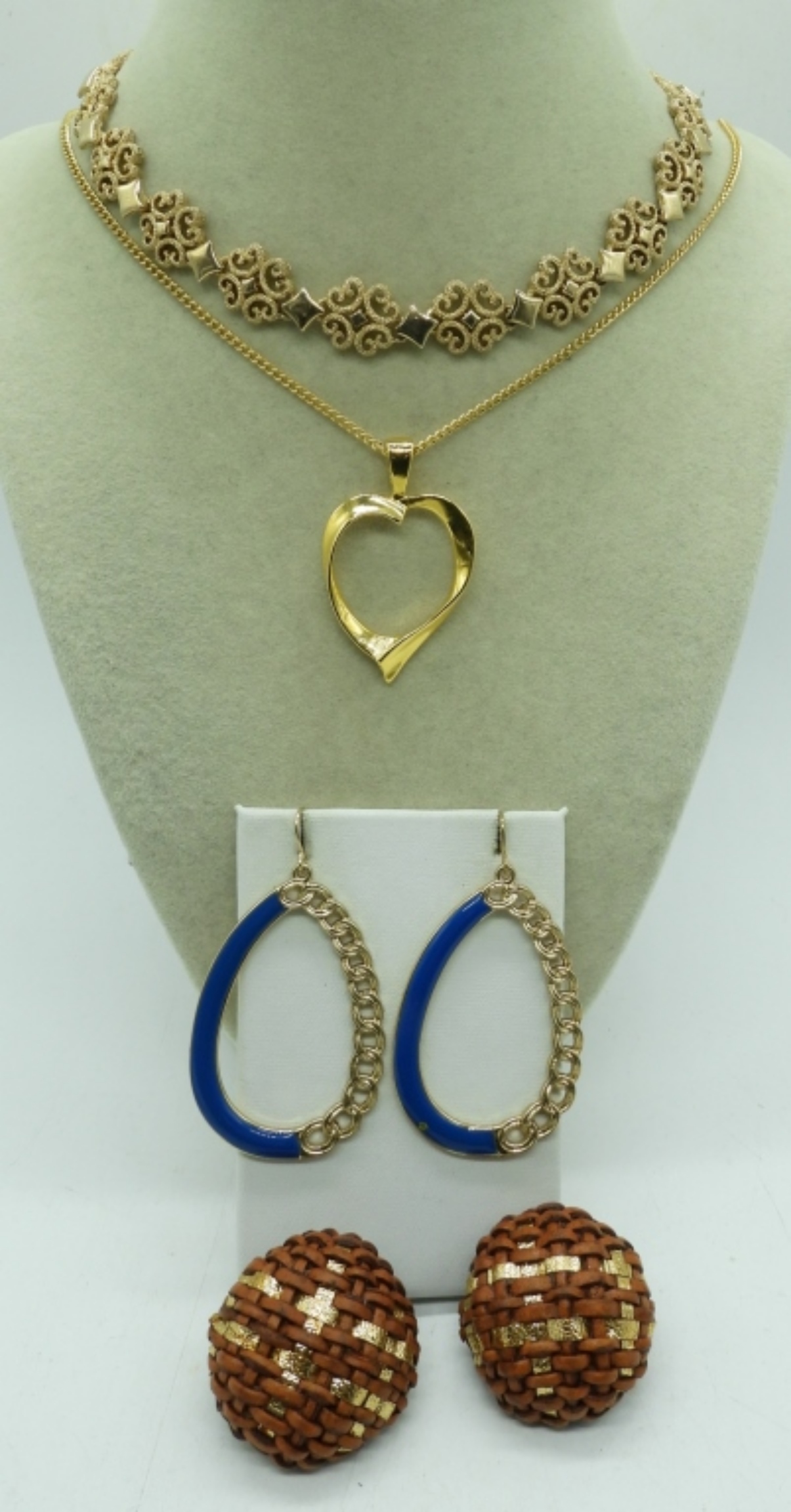 4 PIECE GOLD TONE LADIES JEWELRY, 24″ GOLD TONE NECKLACE WITH A HEART PENDANT,14″ GOLD TONE DECRETIVE NECKLACE, AND 2 PAIR OF EARRINGS