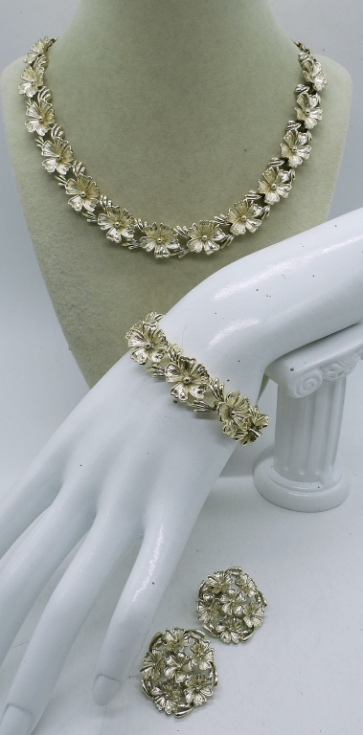 3 PIECE GOLD TONE MATCHING JEWELRY SET,16″ FLOWER GOLD TONE NECKLACE AMATCHING 3″ BRACELET AND EARRINGS