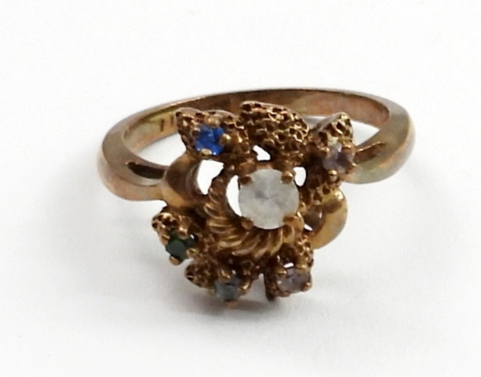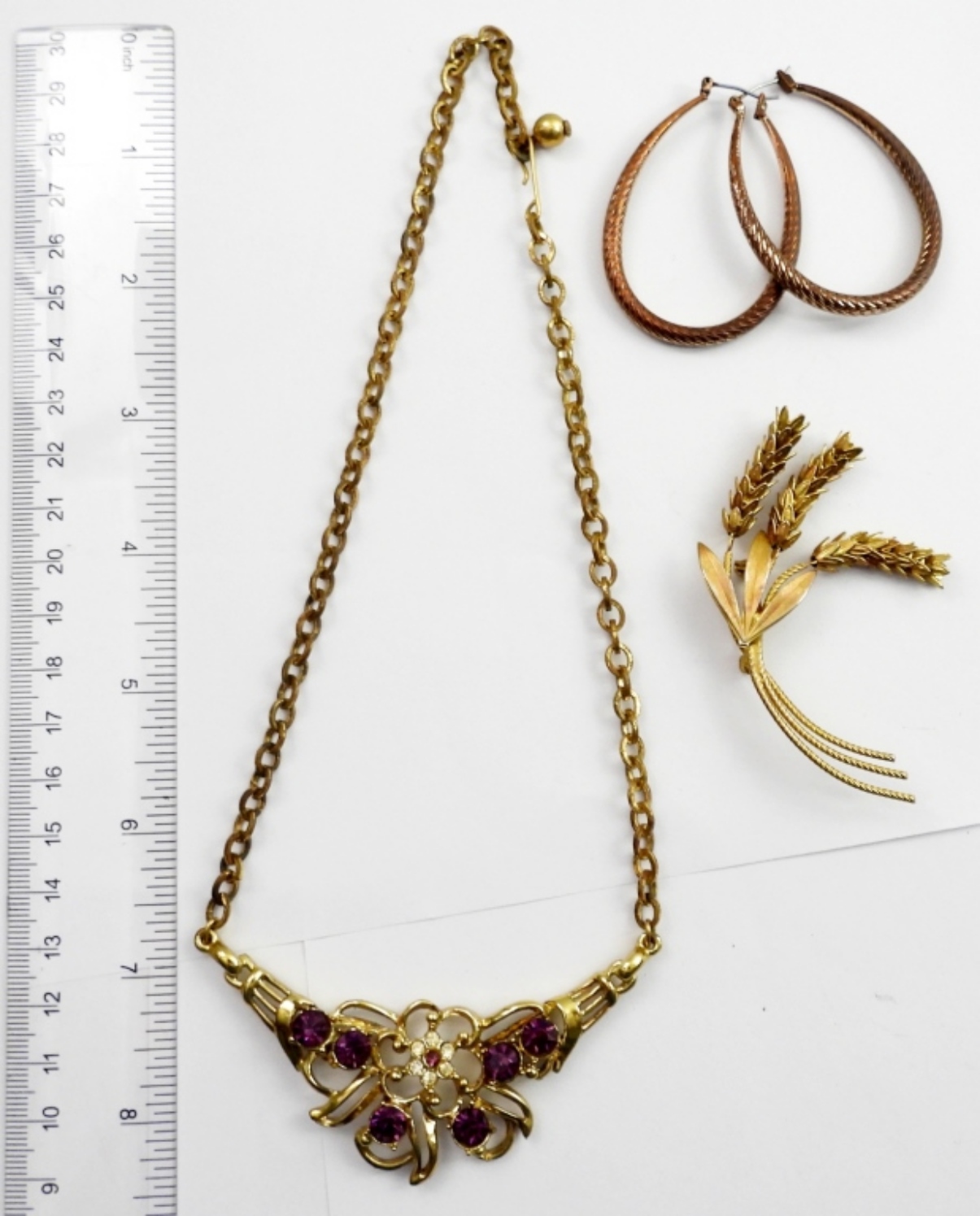 14″VINTAGE GOLD TONE NECKLACE WITH PURPLE STONES,1 GOLD TONE BROOCH,A PAIR OF GOLD TONE EARRINGS ,SIZE 8 RING WITH MUTI COLIR STONES
