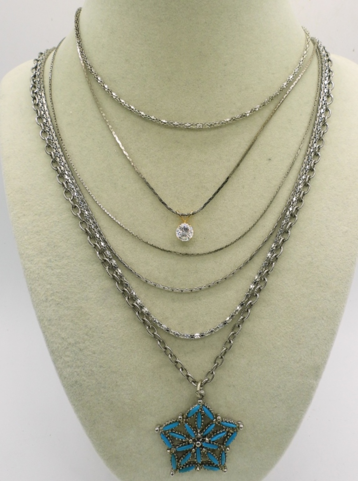 EIGHT SILVER TONE CHAINS/NECKLACES, TWO PENDANTS. 18″ – 24″.
