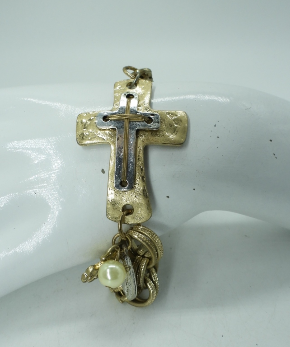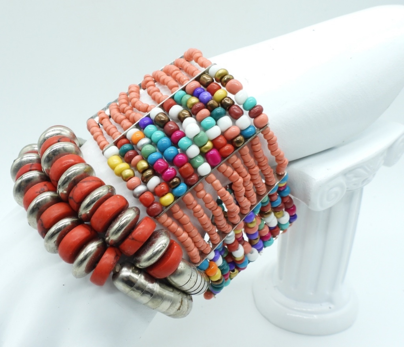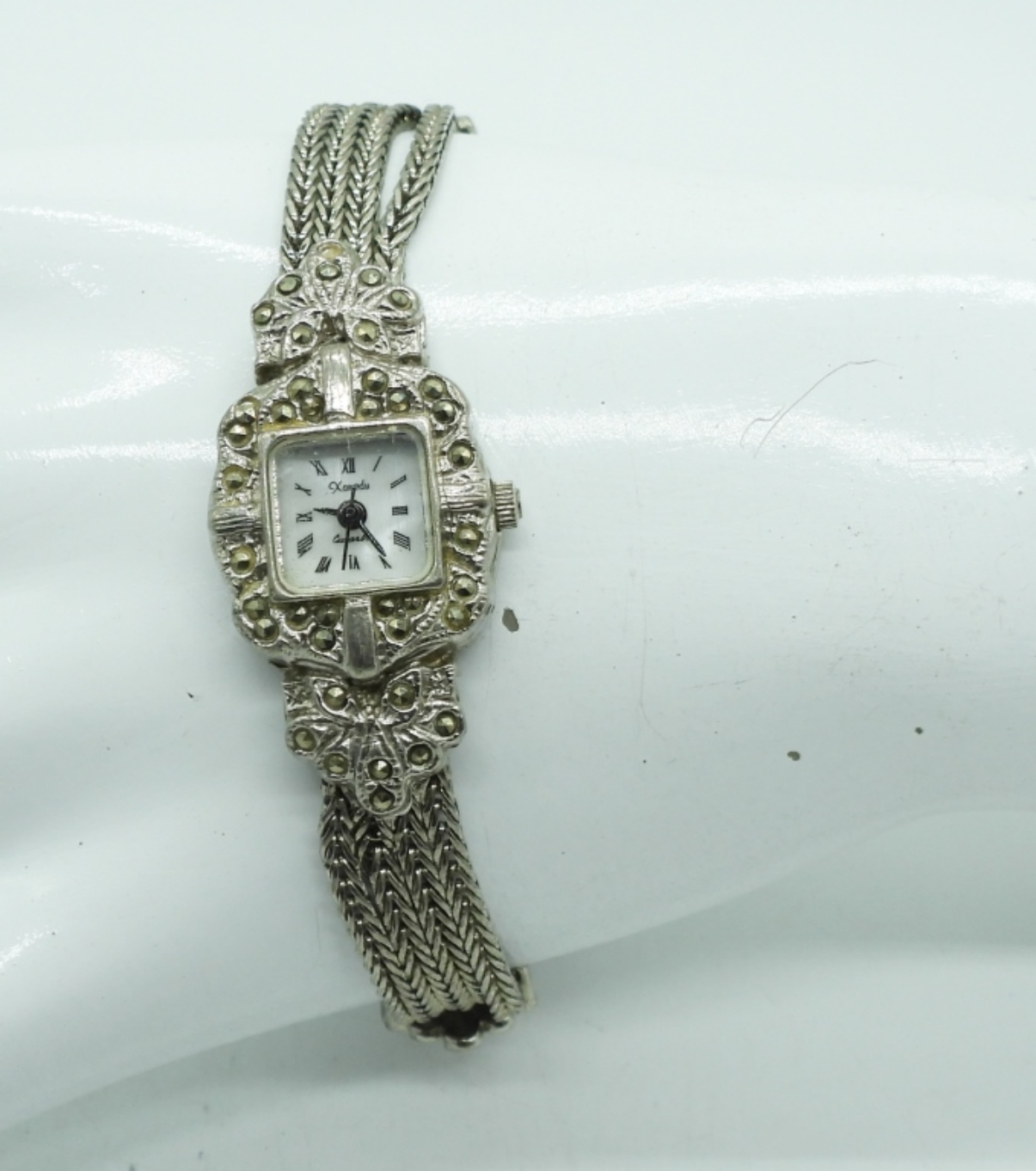 FOUR FASHION BRACELETS, STRETCHY & 8″. ONE SILVER TONE VINTAGE XANADU BRAND WATCH, 7.5″.