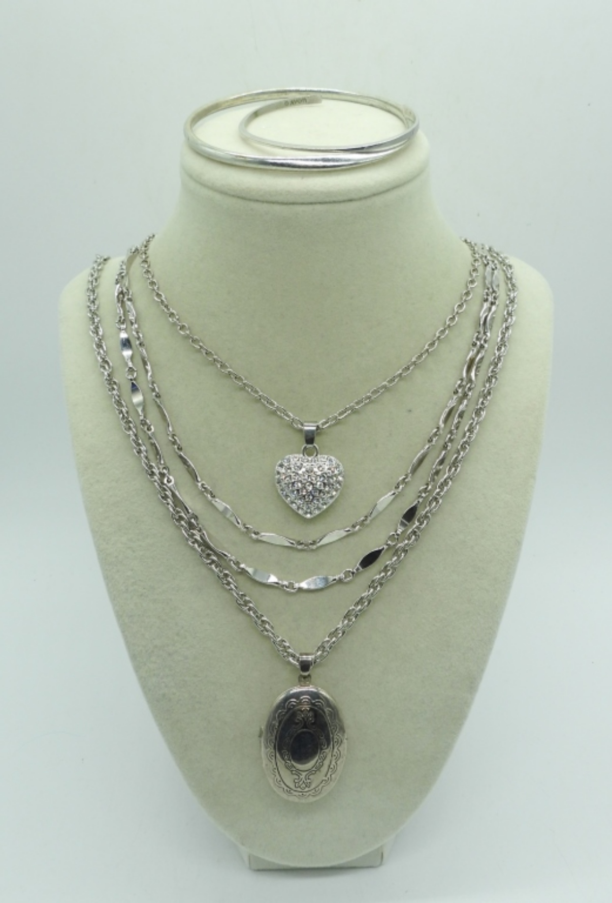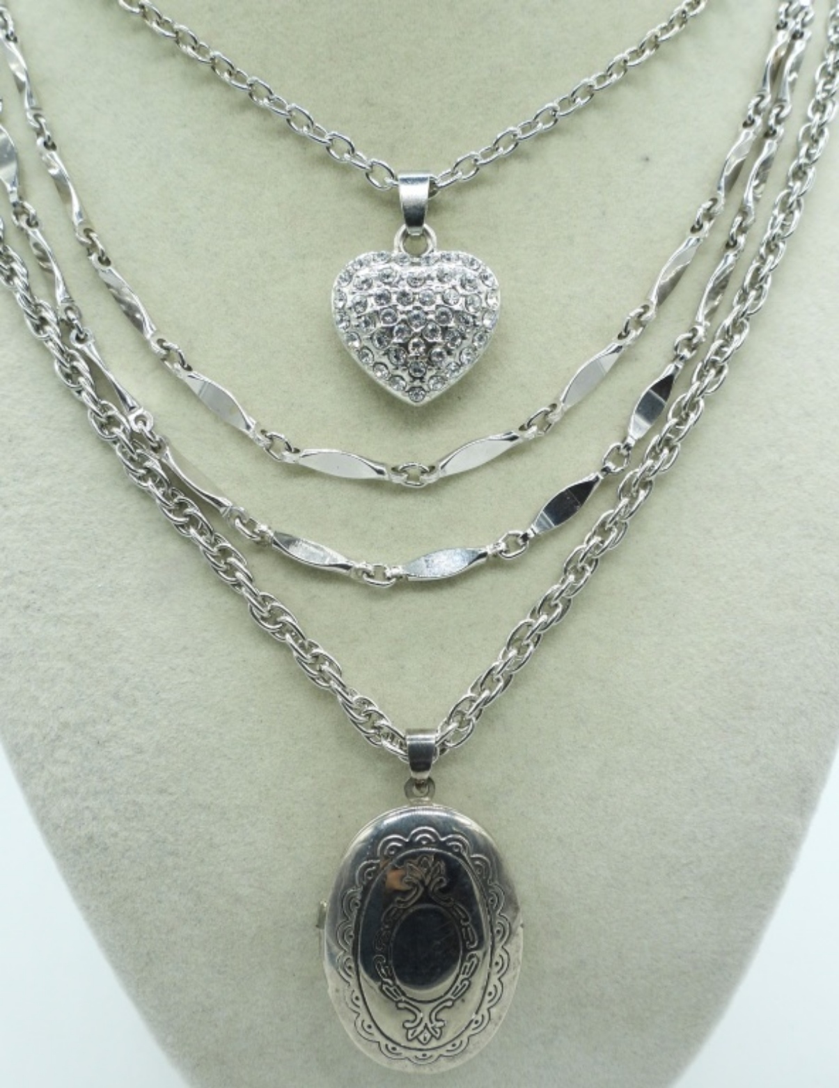 Three Silver Tone Necklaces. 19″, 24″, 38″. Two Silver Tone Bracelets.