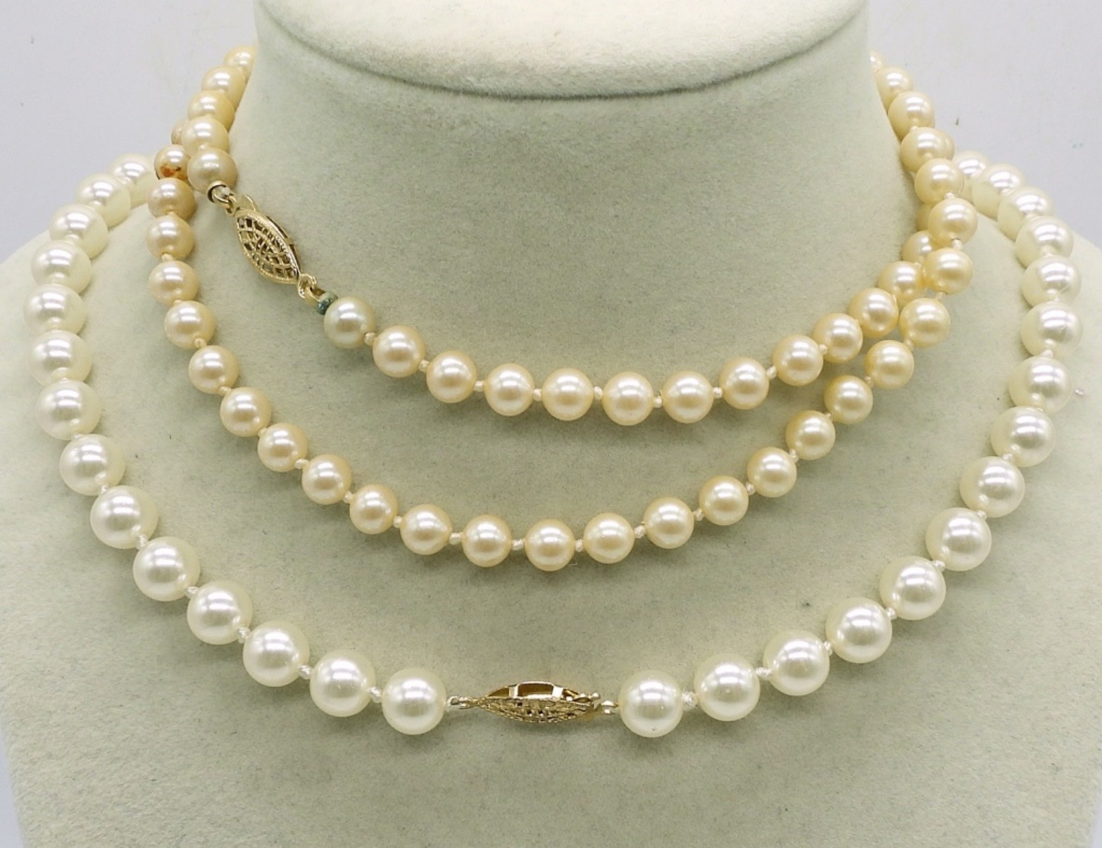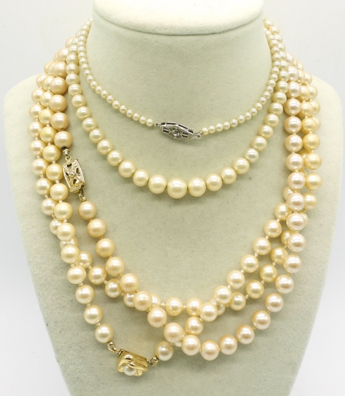 7 VINTAGE NECKLACES, PEARLS AND BEADS. 18″-36″. 3 FAUX PEARL BRACELETS, CLASPED & STRETCHY.