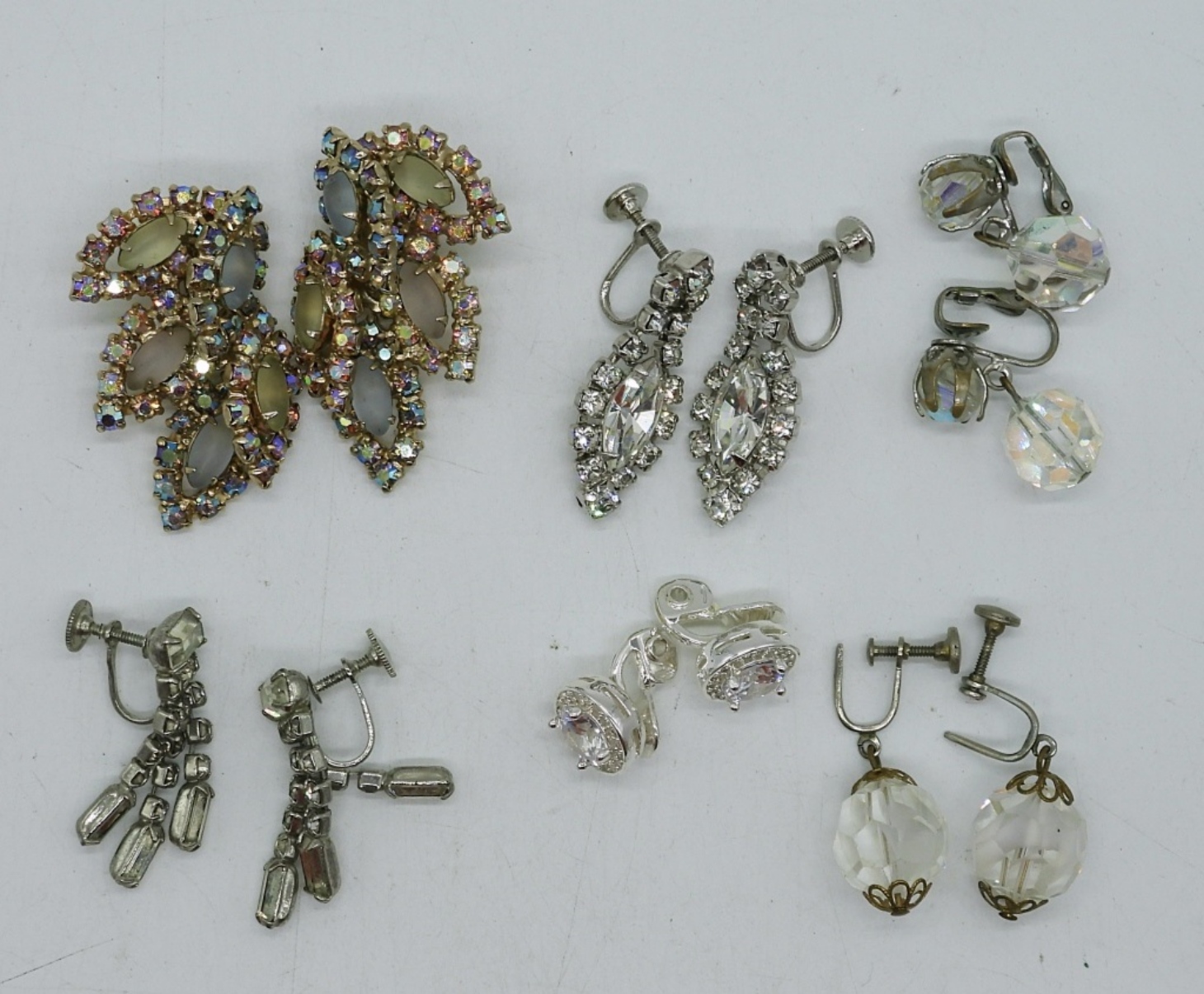 SIX PAIR OF SILVER TONE RHINESTONE AND GLASS BEADED, SCREW BACK & CLIP ON EARRINGS.