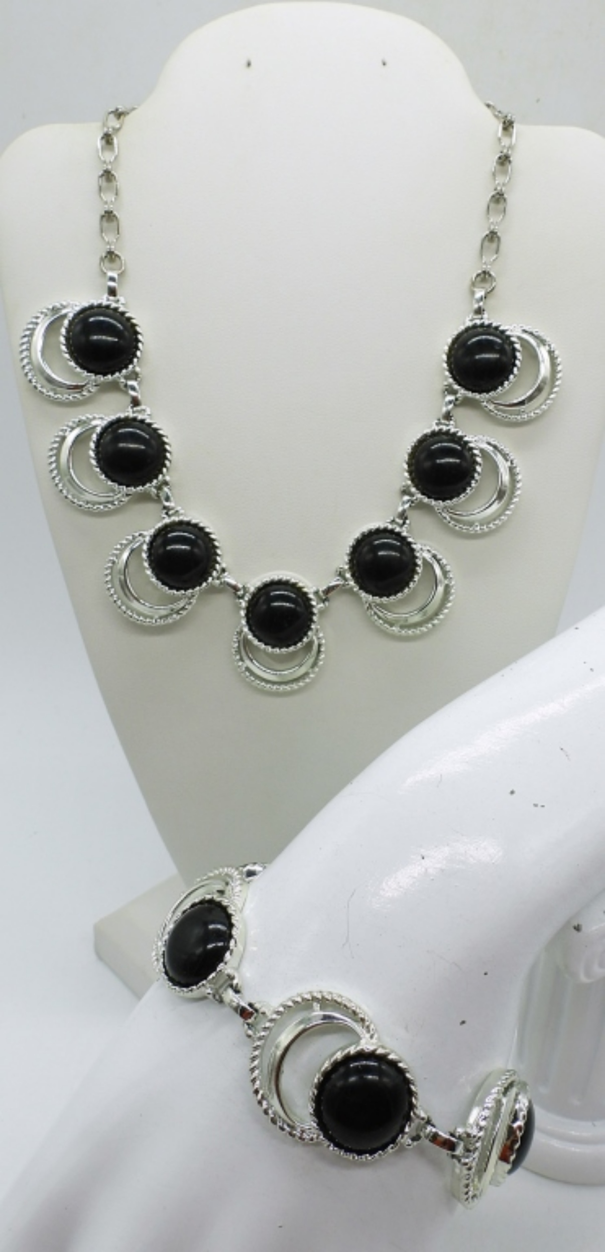 SILVER TONE, BLACK ACCENTS NECKLACE & BRACELET. 17″ & 7″.