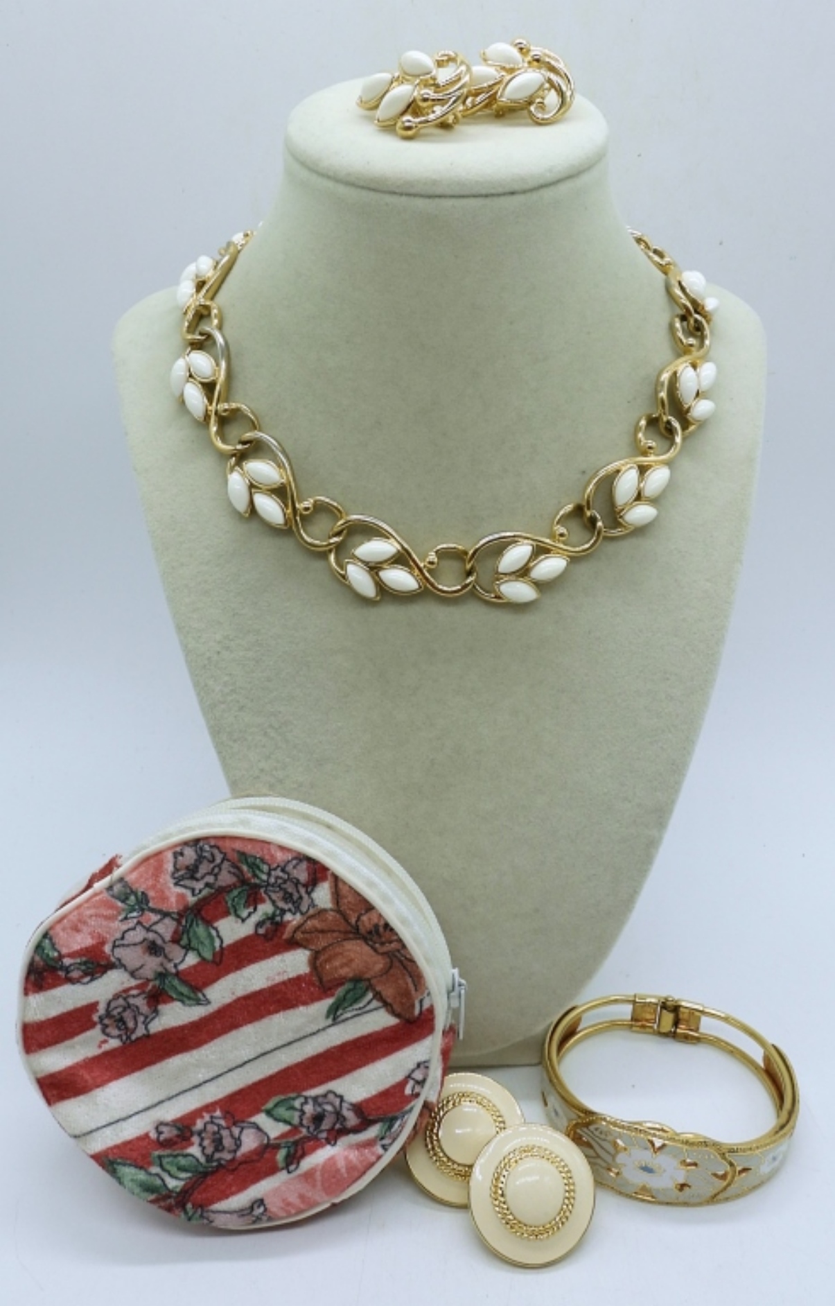 MATCHING TRIFARI NECKLACE & EARRINGS, GOLD TONE WITH WHITE ACCENTS. NECKLACE 18″. SCREW BACK EARRINGS, ENAMELED BRACELET, 8″. AND LITTLE BAG.