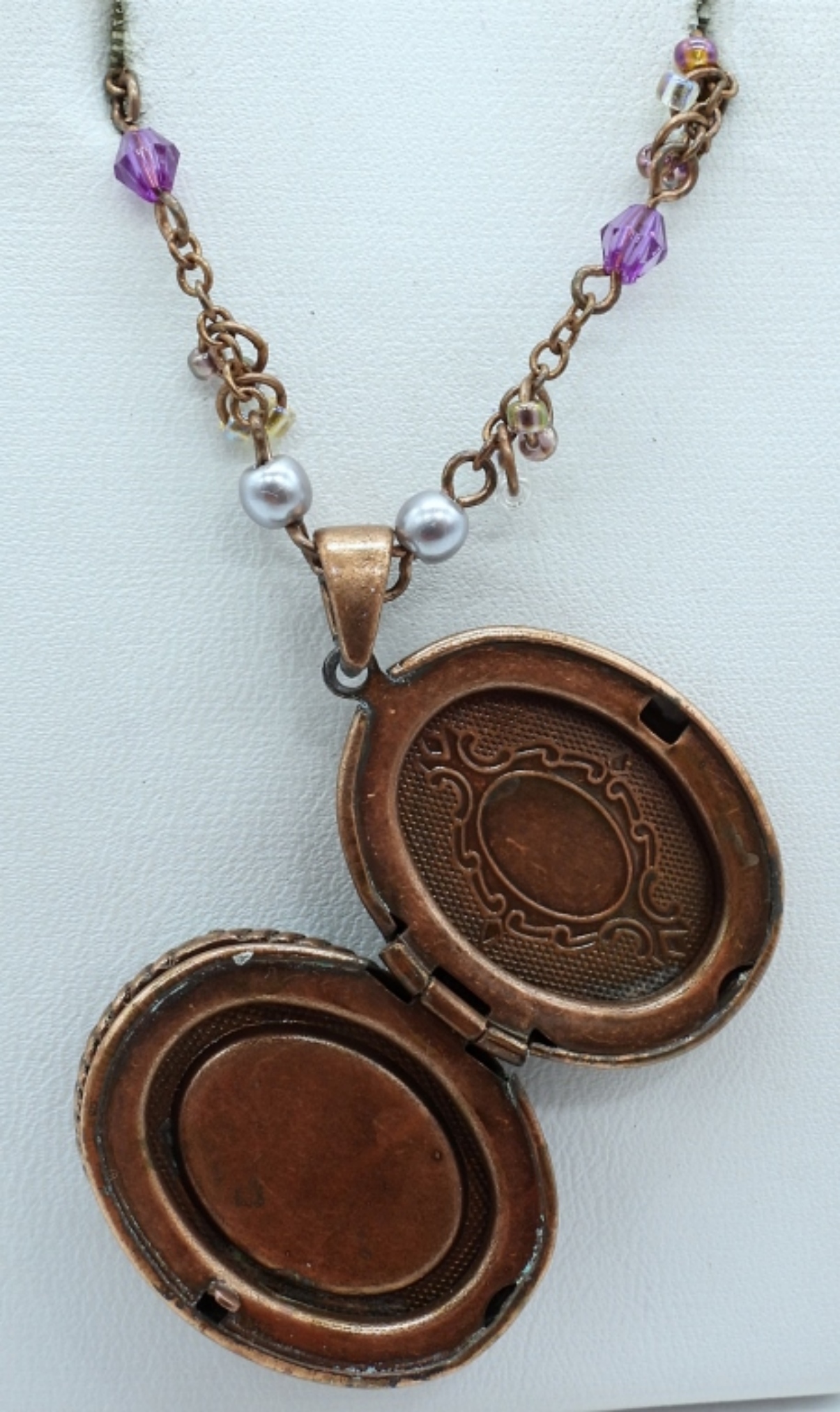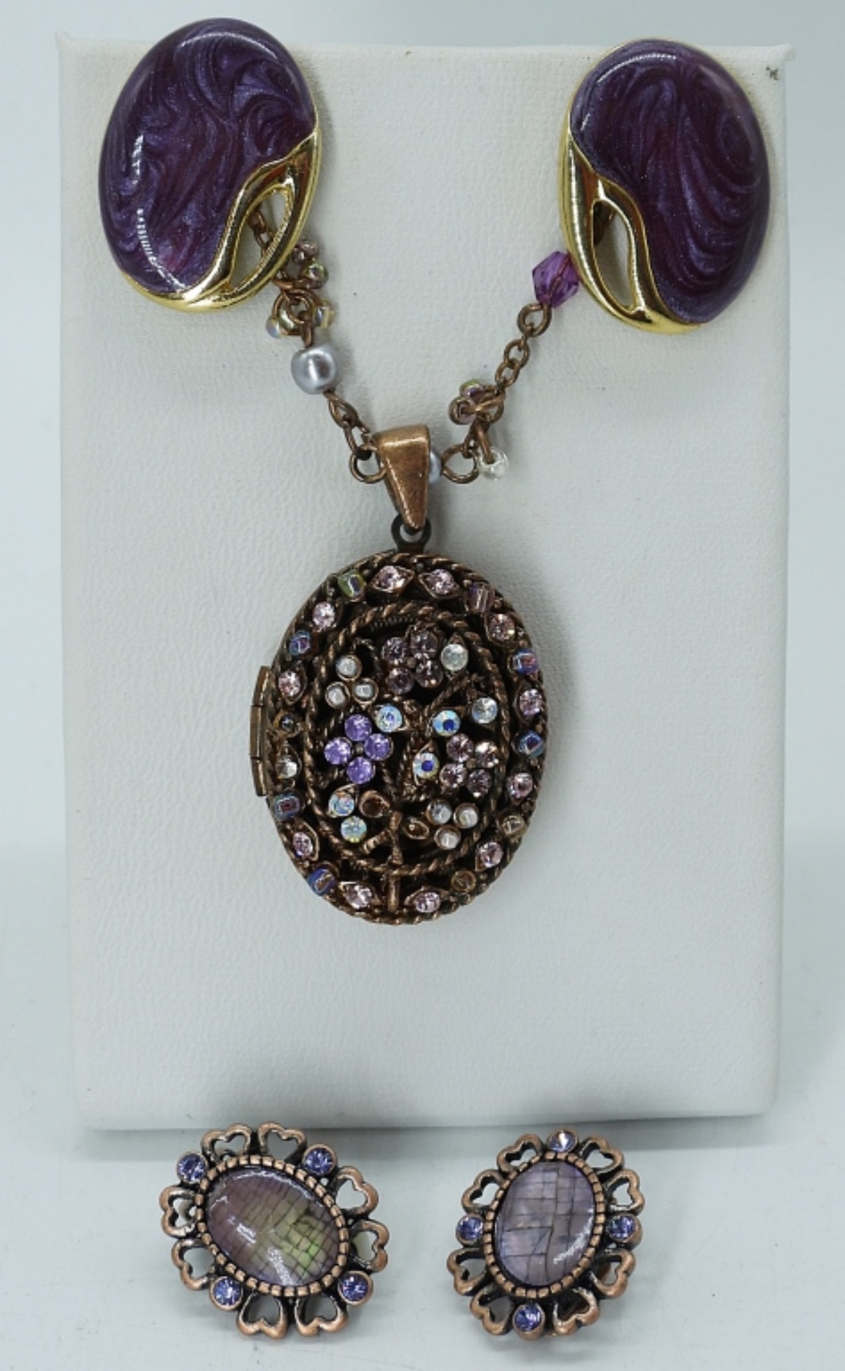18″ PURPLE GEMSTONE LOCKET AND TWO PAIR OF PURPLE EARRINGS. ONE PIERCED, ONE CLIP ON.