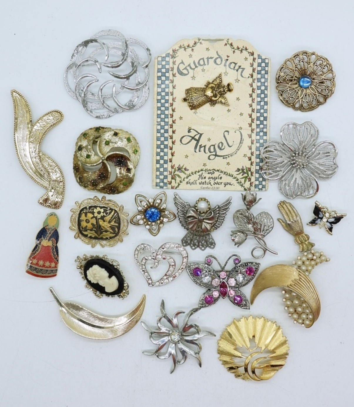 20 GOLD AND SILVER TONE VINTAGE BROOCHES. ALL SIZES AND STYLES