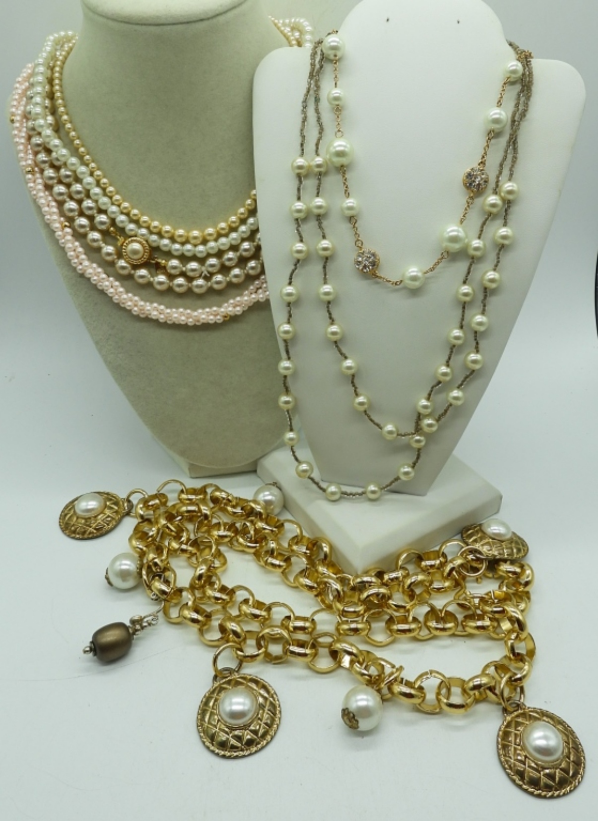 7 FAUX PEARL NECKLACES. 18-40″.