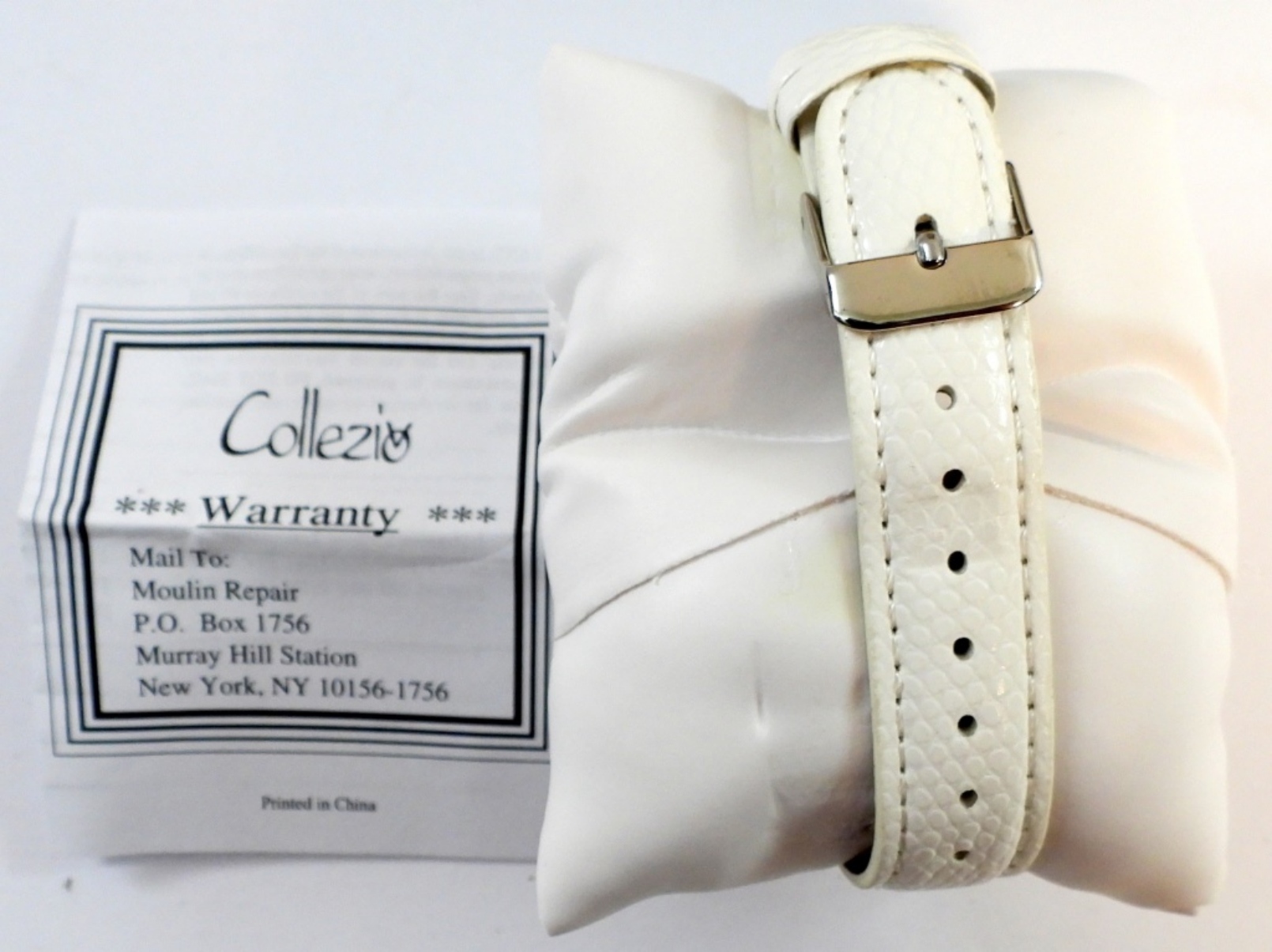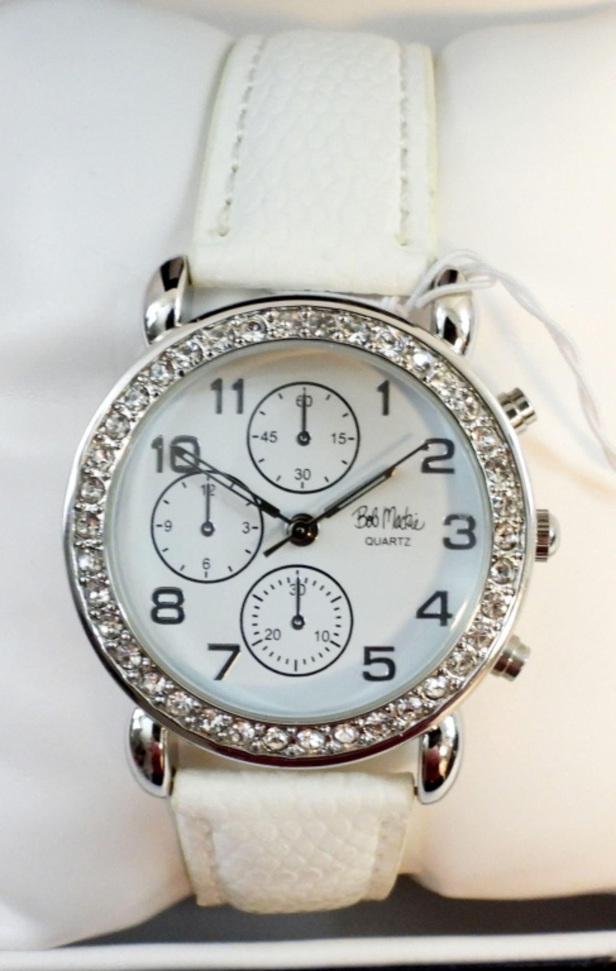 BOB MACKIE WHITE “DIAMOND” (NOT REALLY DIAMONDS) WATCH WITH SILVER FACE AND WHITE LEATHER BAND. NEW WITH BOX. NOT TESTED AS TO WORKING OR NOT.