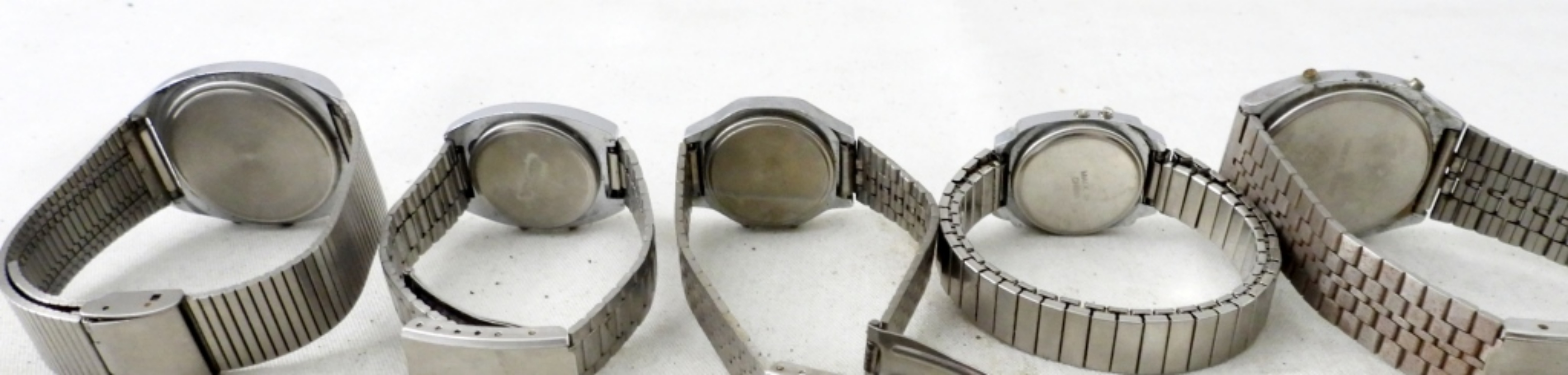 UNTESTED (5) LCD QUARTZ DIGITAL WATCHES, SILVERTONE, SAMTRON, RITY, CHRYSLER, OTHER UNKNOWN BRAND, MIX OF METAL LINK AND STRETCH METAL BANDS