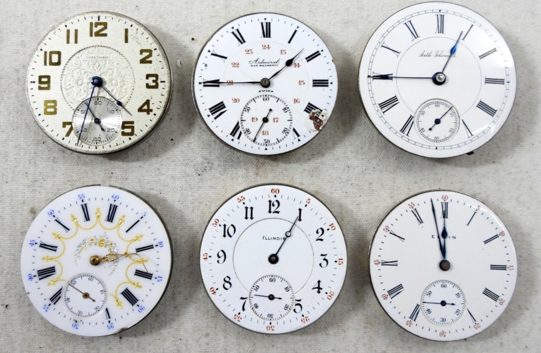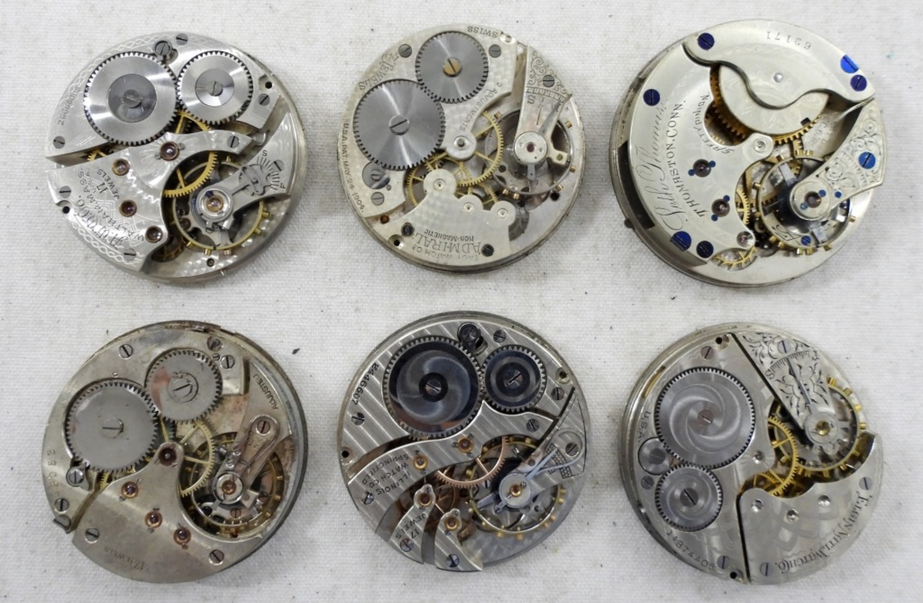 (6) 16-18 SIZE POCKET WATCH MOVEMENTS , FOR PARTS AND REPAIR ,THOMASTON, ADMIRAL AND MORE