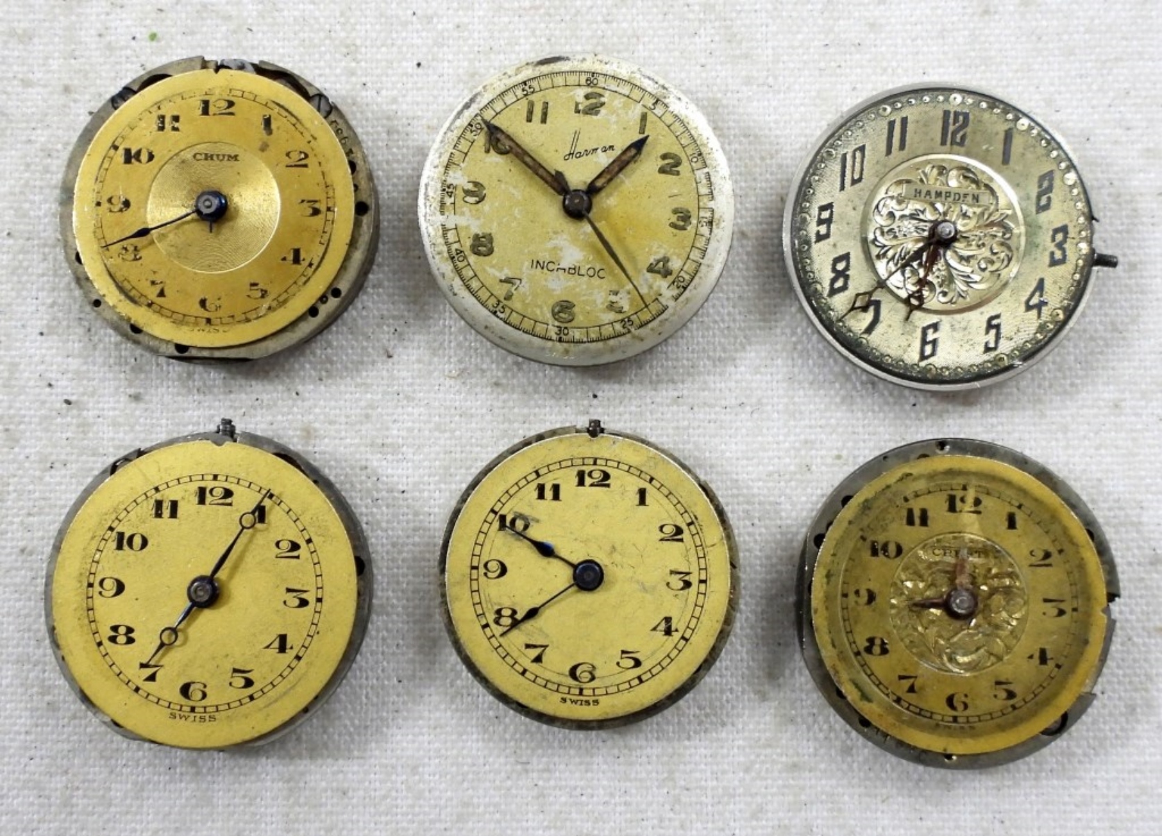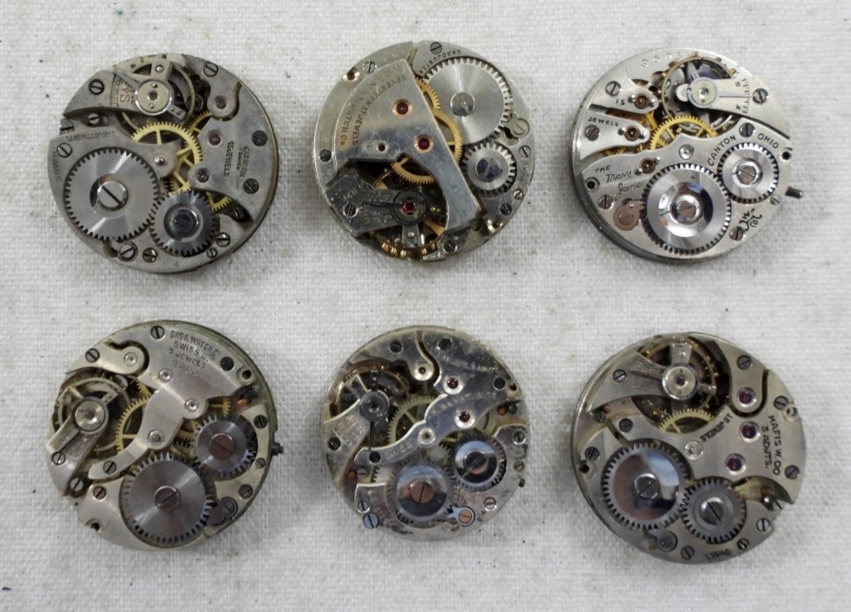 (6) 0 SIZE POCKET WATCH MOVEMENTS, ( GOLD TONE ) FOR PARTS AND REPAIR, HAMPDEN, HARMAN & MORE
