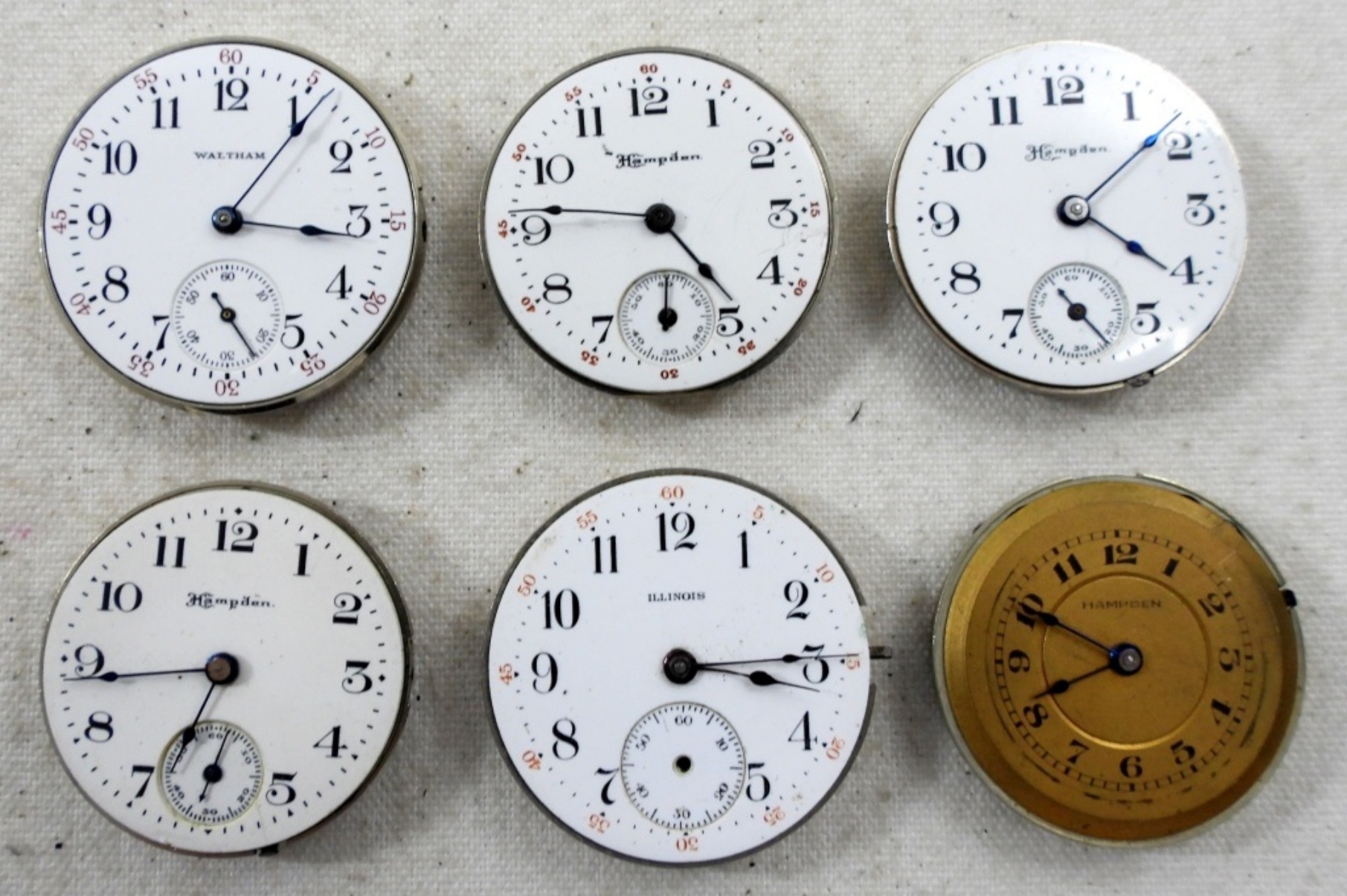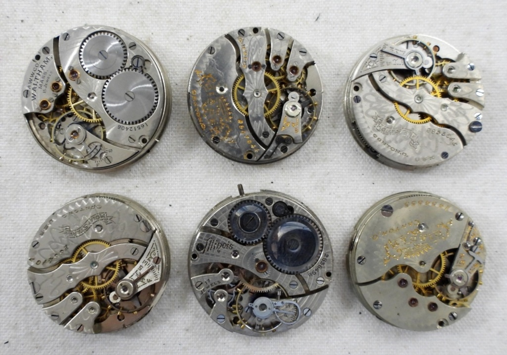 (6) 3/ 0 SIZE POCKET WATCH MOVEMENTS, FOR PARTS AND REPAIR, ILLINOIS, HAMPDEN & MORE