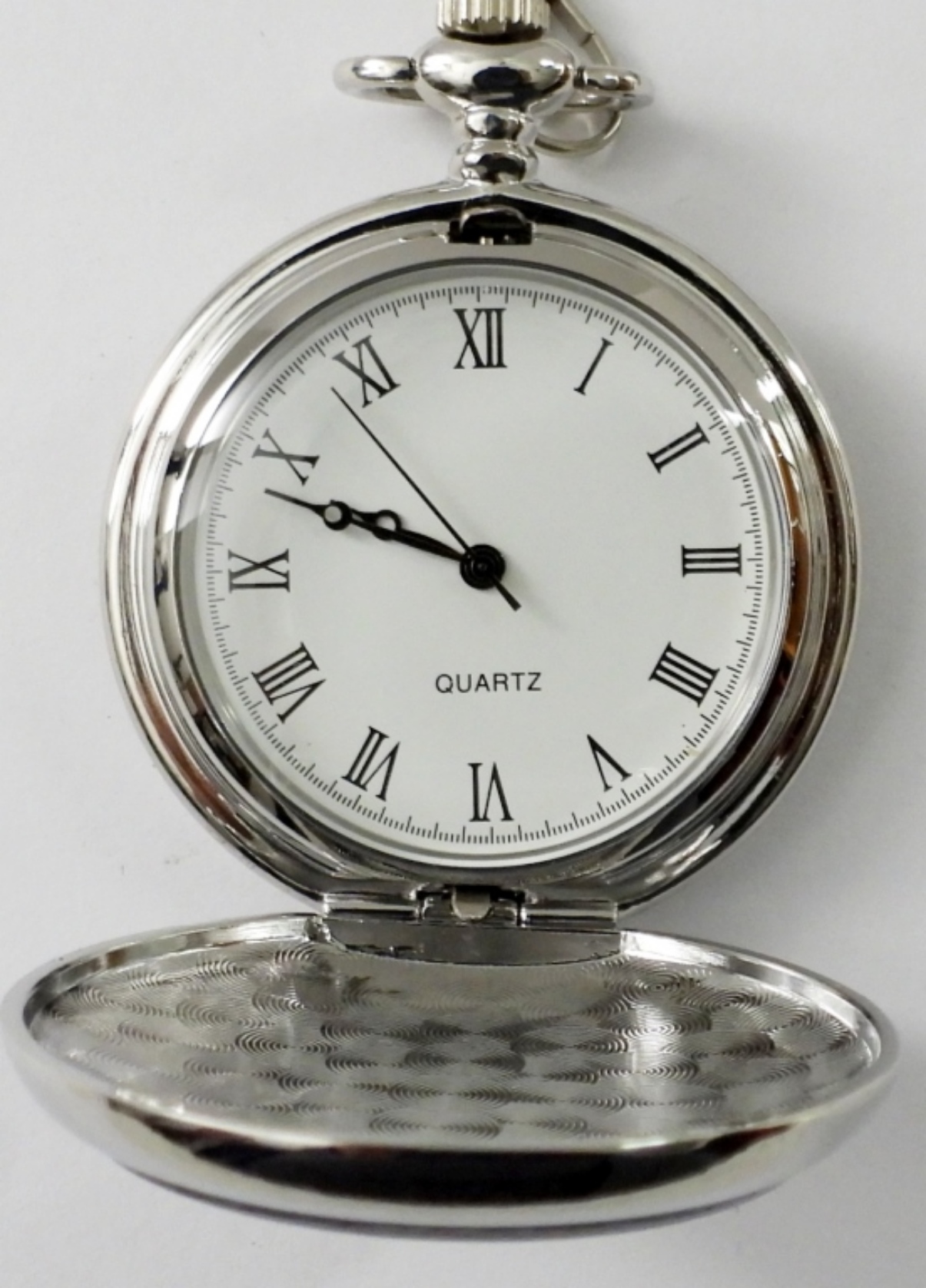WORKING QUARTZ 16 SIZE POCKET WATCH, SILVER TONE WITH CHAIN. AMERICAN FLAG ,BALD EAGLE . NOT TESTED AS TO KEEPING TIME OR NOT
