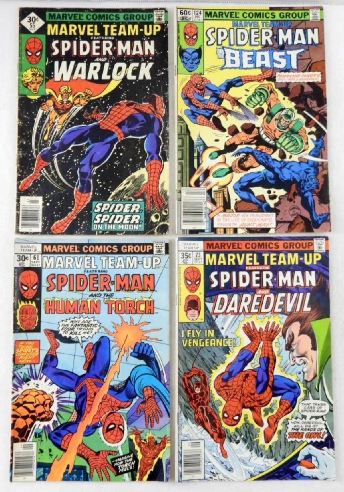 (4) BRONZE MARVEL TEAM-UP COMICS, # 55 1ST APPEARANCE OF POWER GEM AND TIME GEM, #61 SPIDER-MAN & HUMAN TORCH,# 73 SPIDER- MAN & DAREDEVIL,# 124 SPIDER-MAN & THE BEAST( G-VG+)
