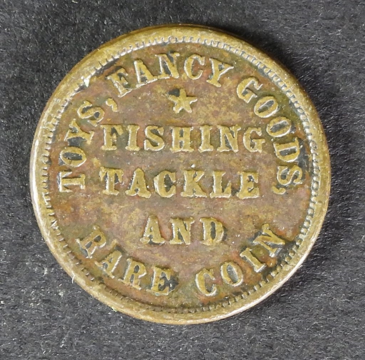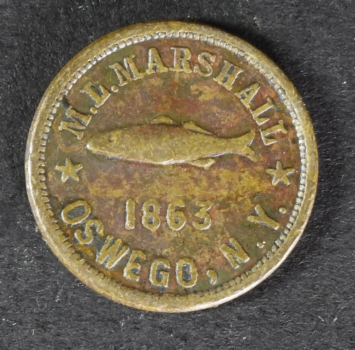 1863 M.L.MARSHALL OSWEGO,NY, TOYS, FANCY GOODS, FISHING TACKLE & RARE COINS CIVIL WAR TOKEN