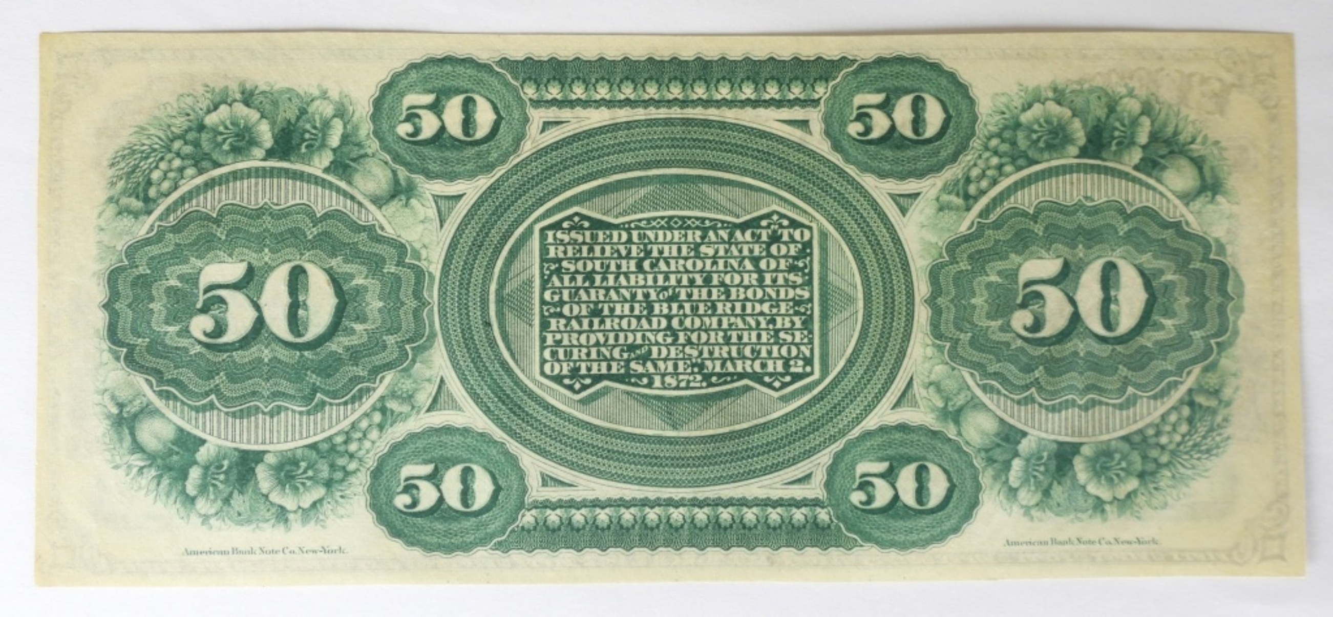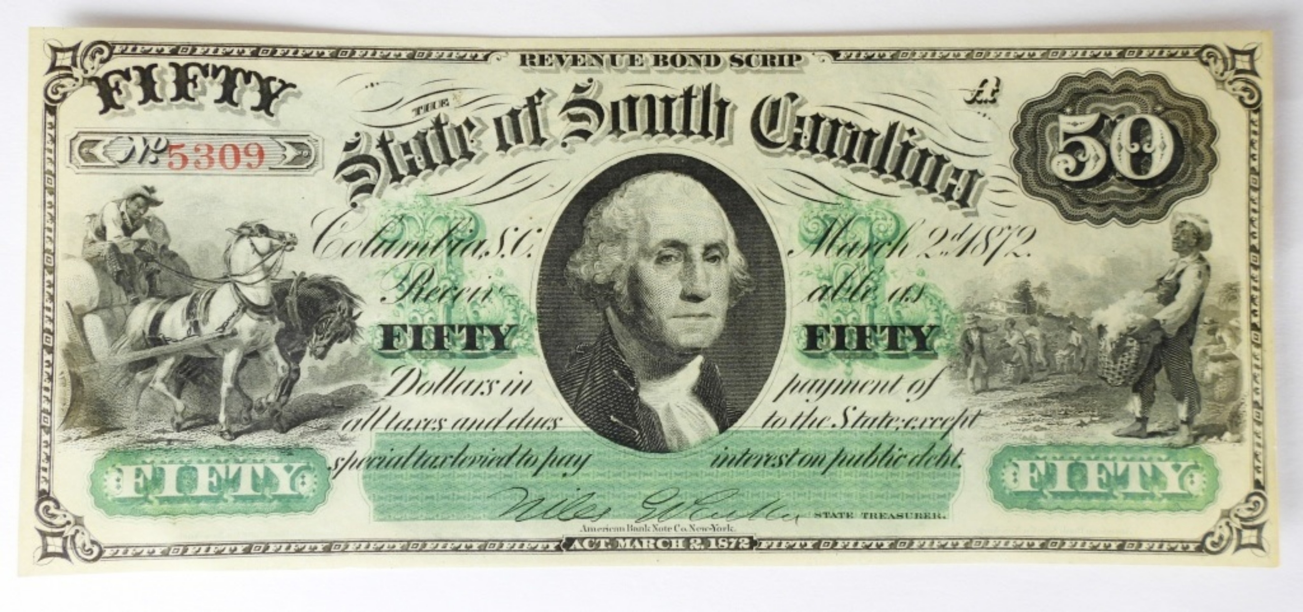 1872 $50 SOUTH CAROLINA BOND SCRIP