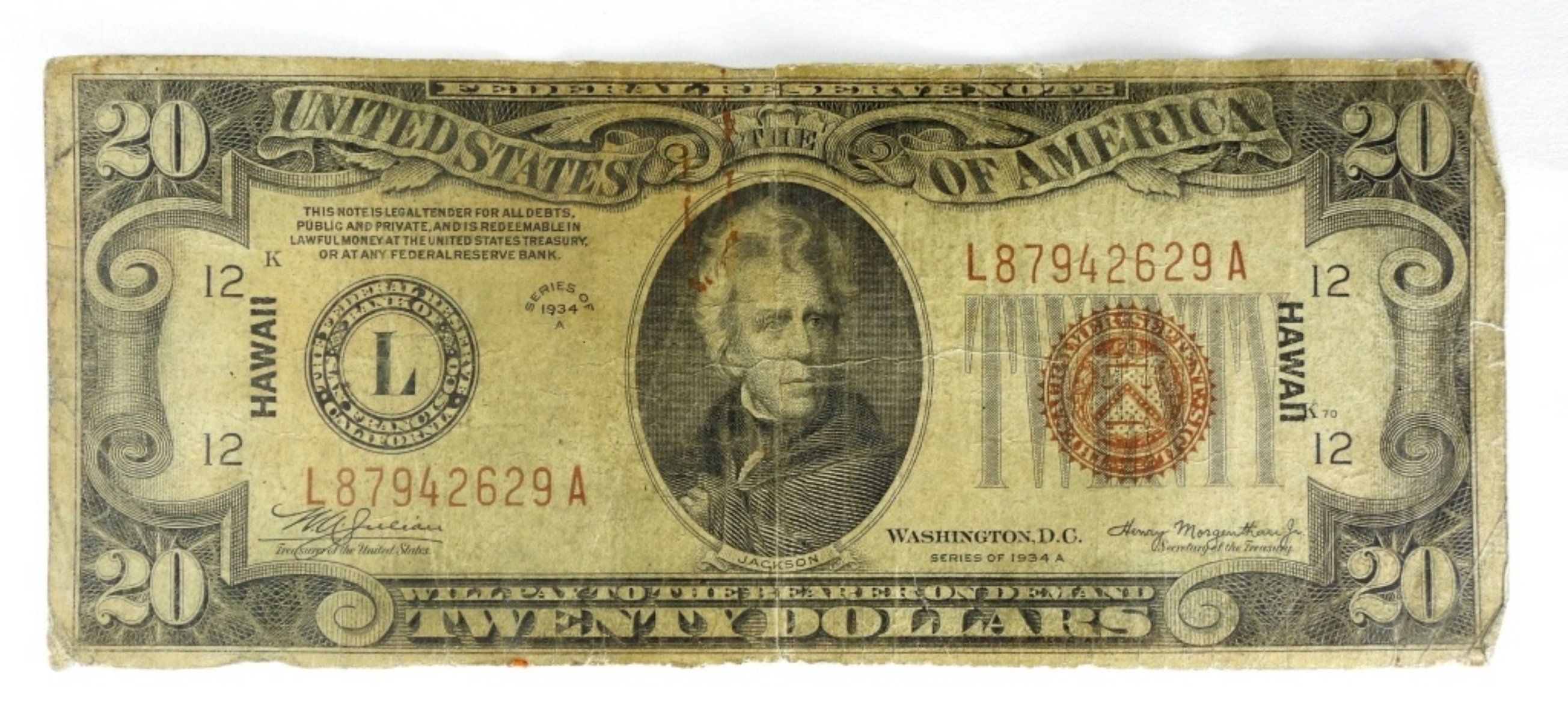 1934 A $ 20 FEDERAL RESERVE NOTE ” HAWAII”