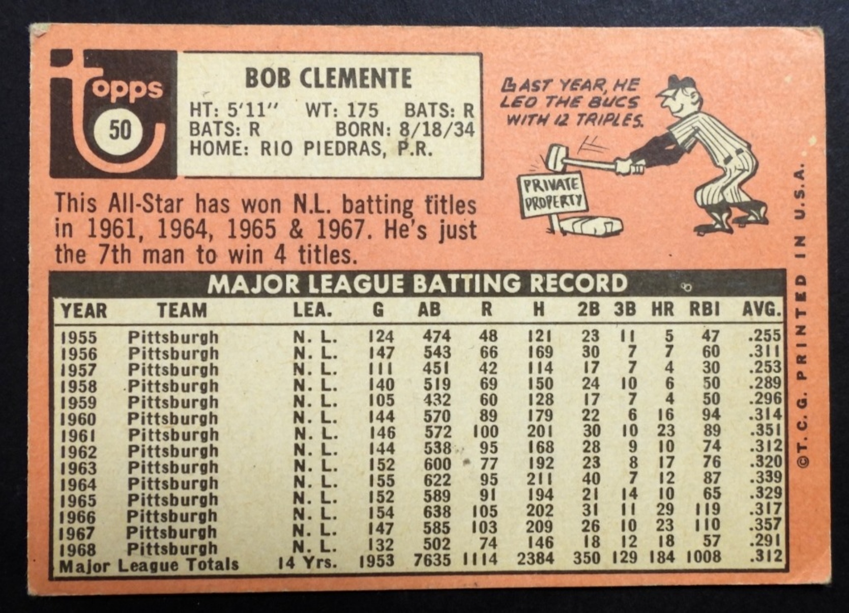 1969 TOPPS # 50 ROBERTO CLEMENTE(VGEX)