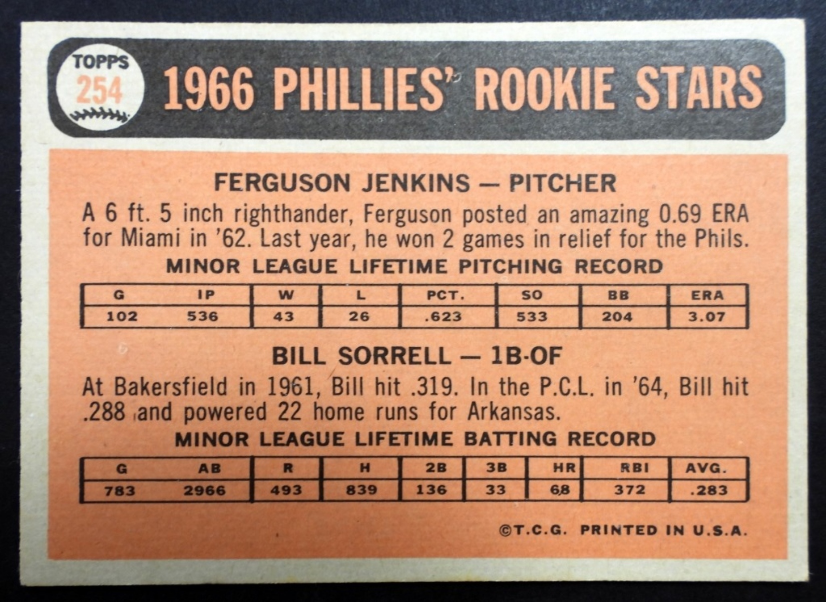 1966 TOPPS #254 PHILLIES ROOKIE STARS ! FERGUSON JENKINS & BILL SORRELL (EX)