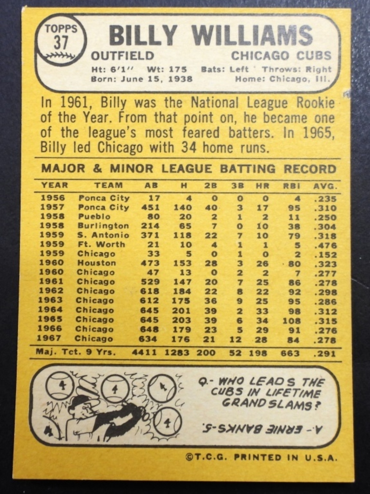 1968 TOPPS #37 BILLY WILLIAMS (VGEX+)