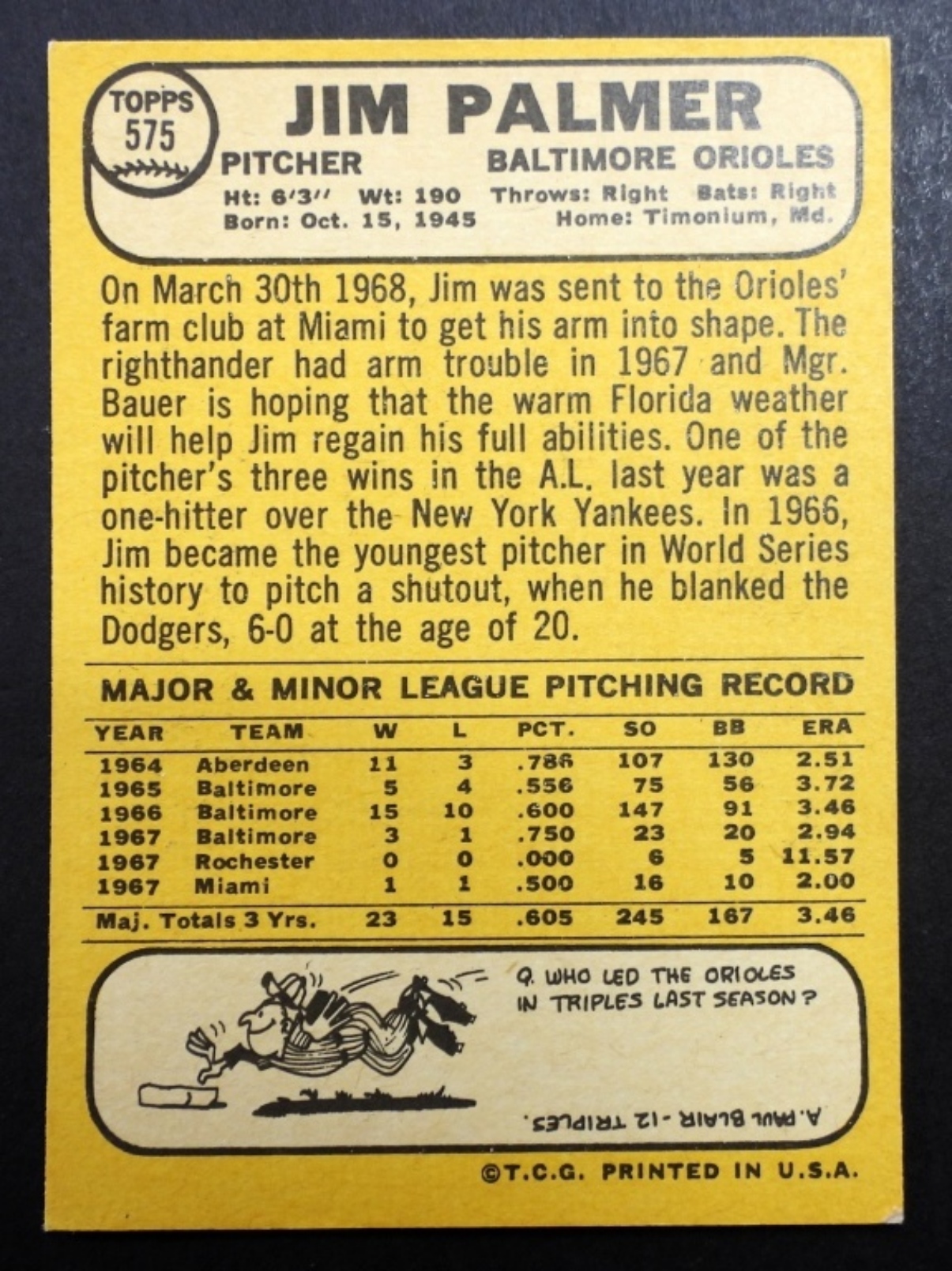 1968 TOPPS #575 JIM PALMER ( VGEX)
