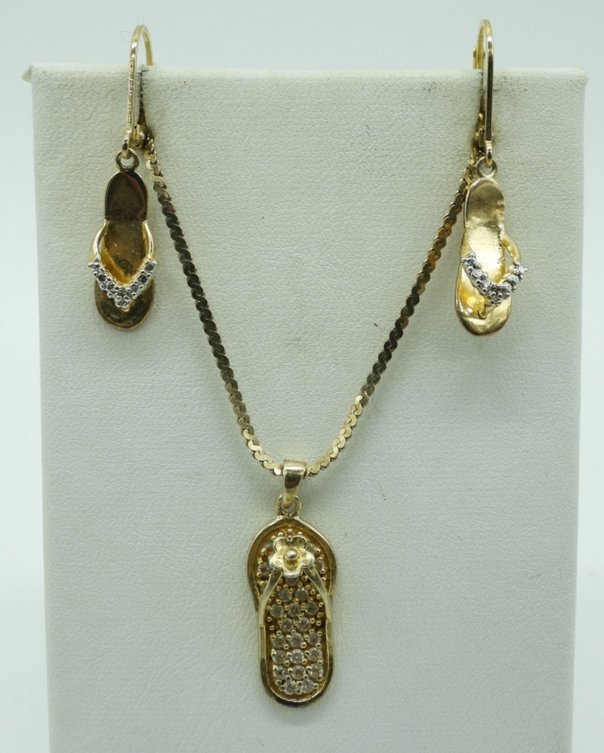 GOLD TONE STERLING JEWELRY SET. SANDAL NECKLACE, 24″ CHAIN WITH MATCHING EARRINGS (PIERCED). GOLD TONE STERLING BRACELET, 7.5″. PIERCED GOLD TONE HOOP EARRINGS. 19.3 DWT