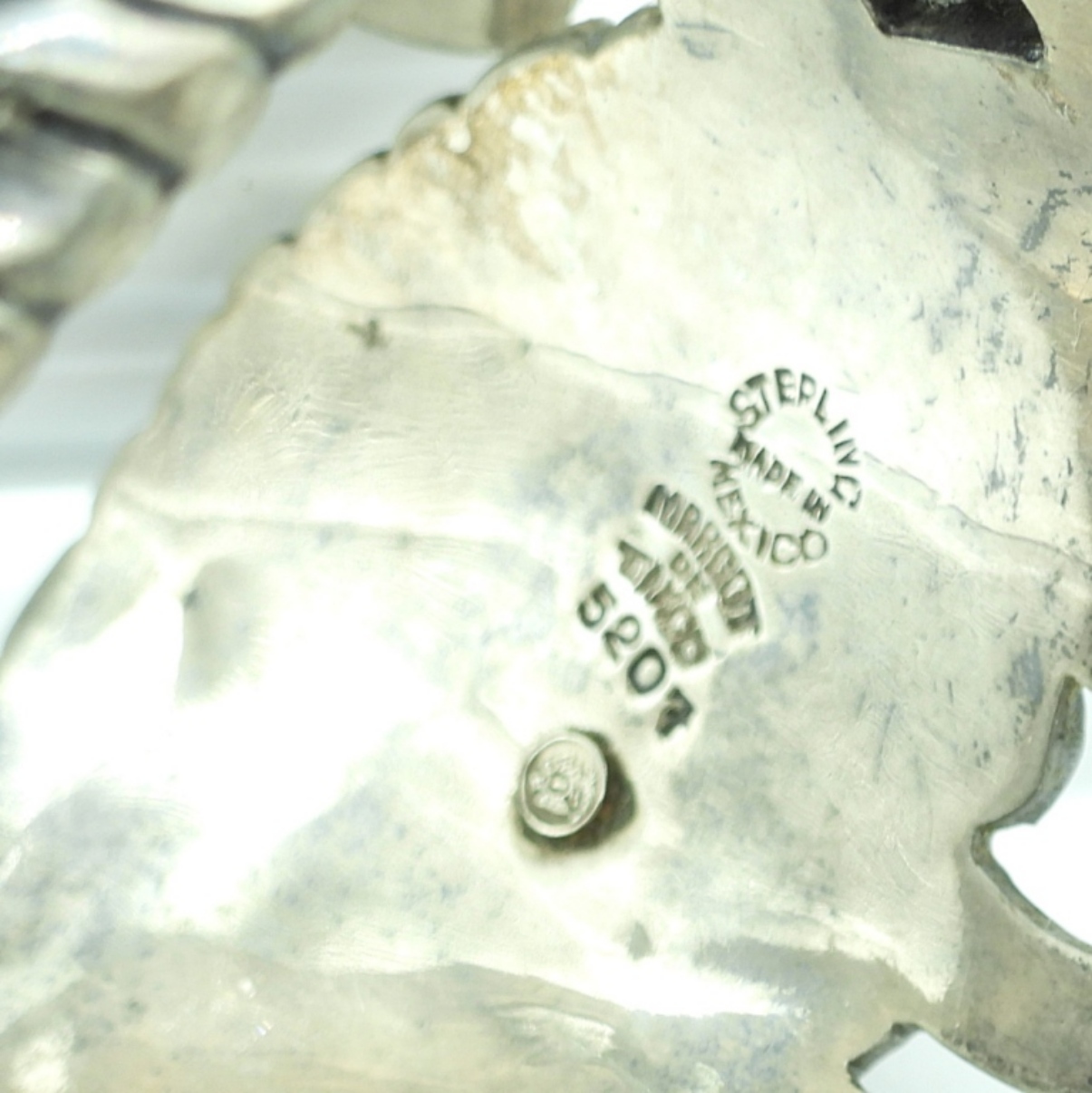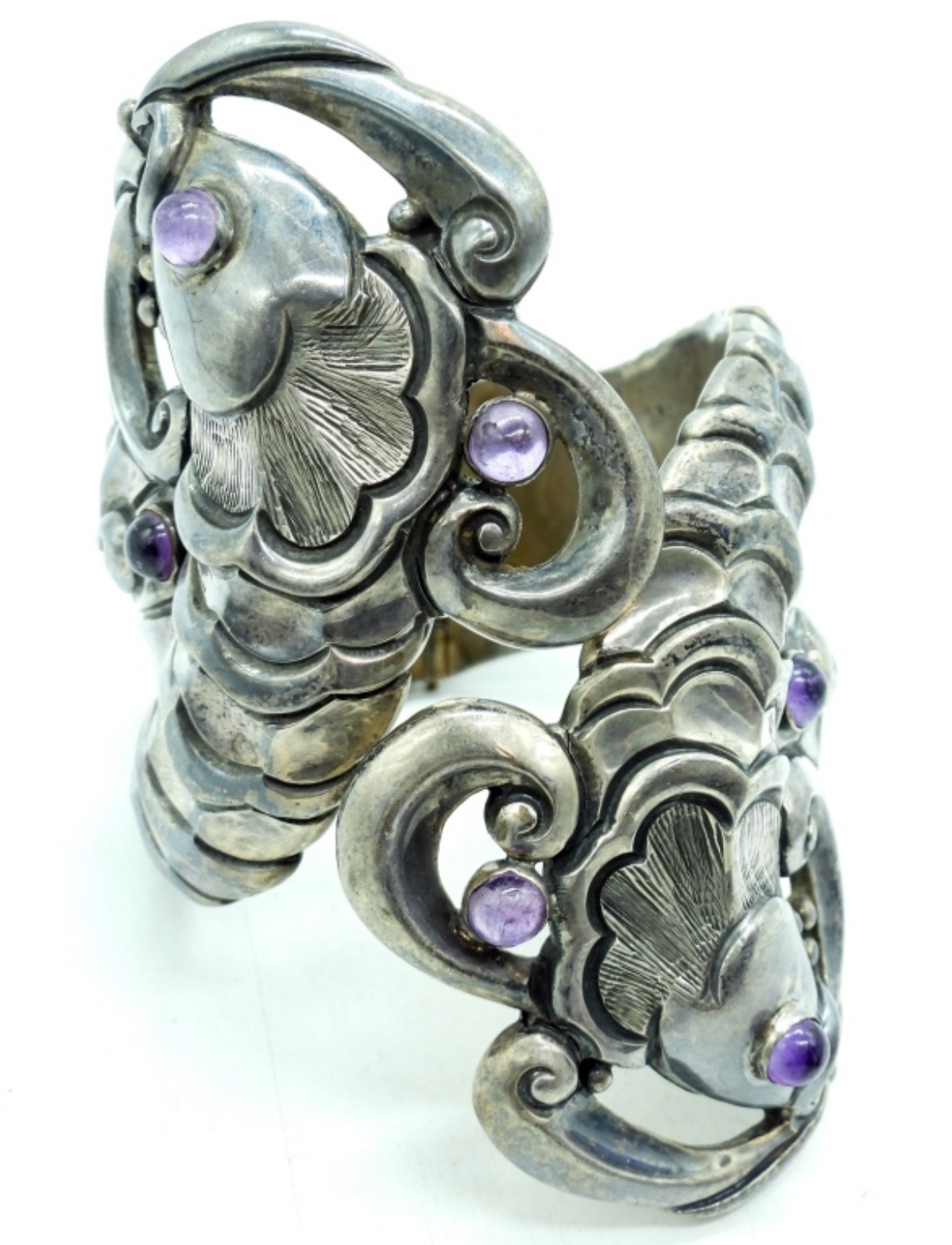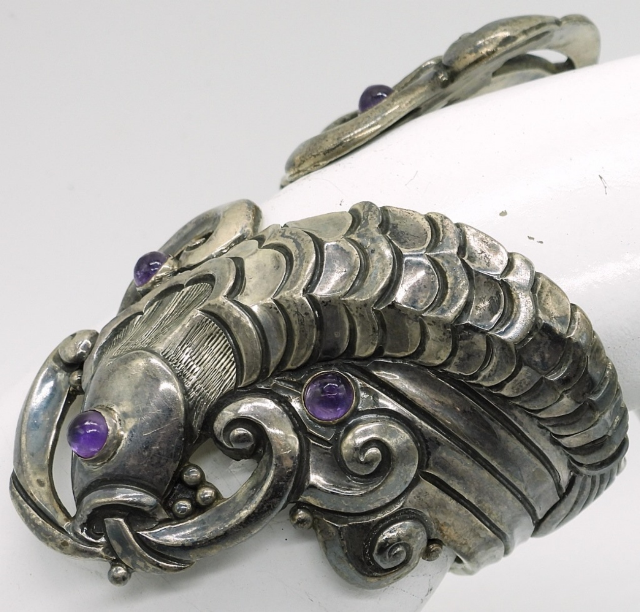 MARGOT de TAXCO STERLING KOI FISH WITH AMETHYST ACCENTS CLAMPER BRACELET, 4″ LONG. SOME TARNISH. 79 DWT
