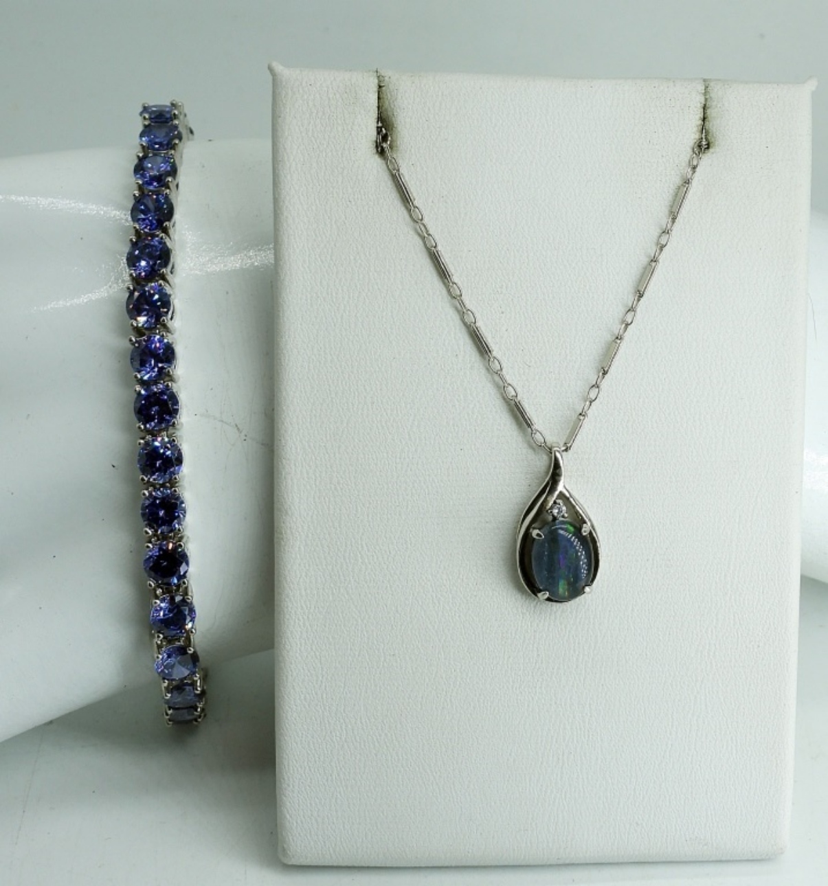 GORGEOUS STERLING PURPLE TENNIS BRACELET, 8″. NECKLACE, 18″. 14.5 DWT