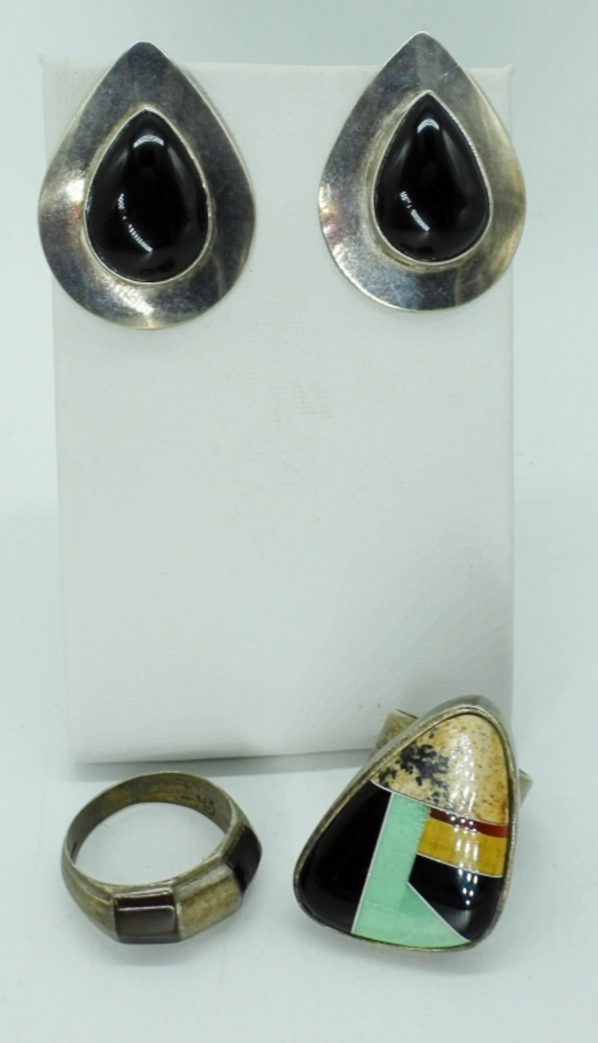 RING SIZES 7.5 & 9.5. PIERCED EARRINGS WITH ONYX GEMSTONE. 23.1 DWT