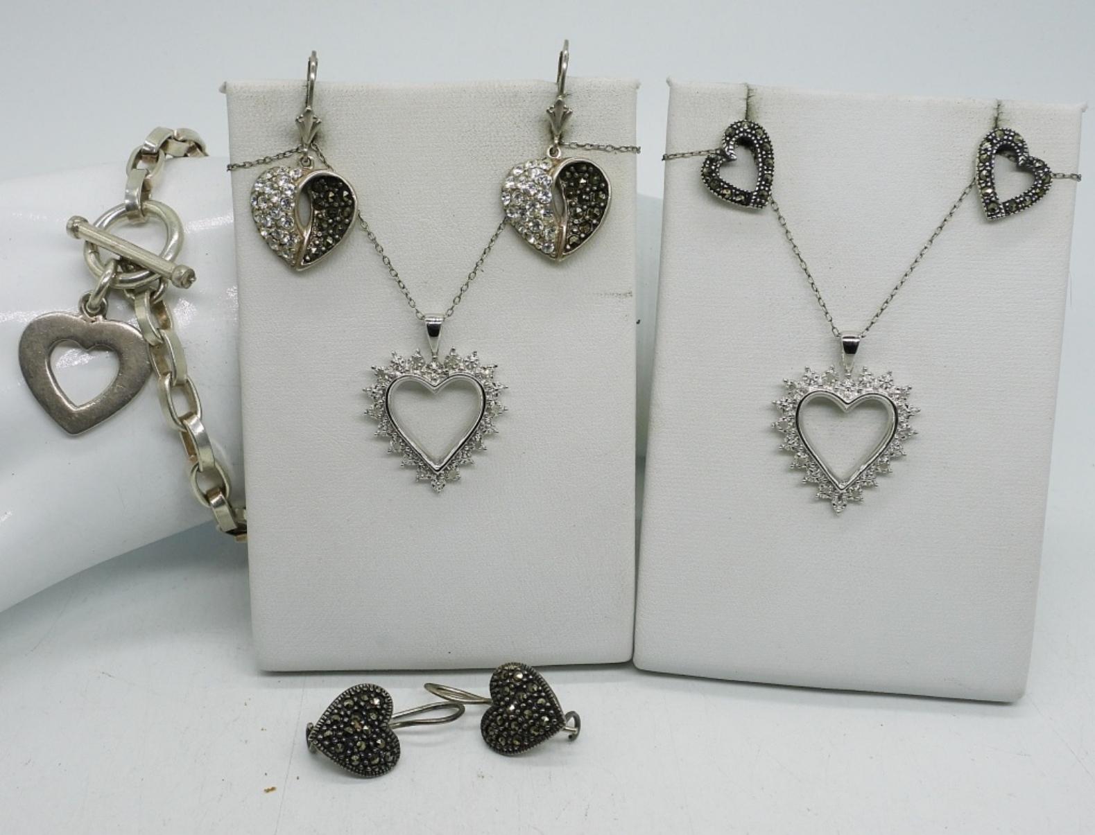 TWO NECKLACES, 18″. BRACELET 7″. 3 HEART SHAPED PIERCED EARRINGS. 22.9 DWT