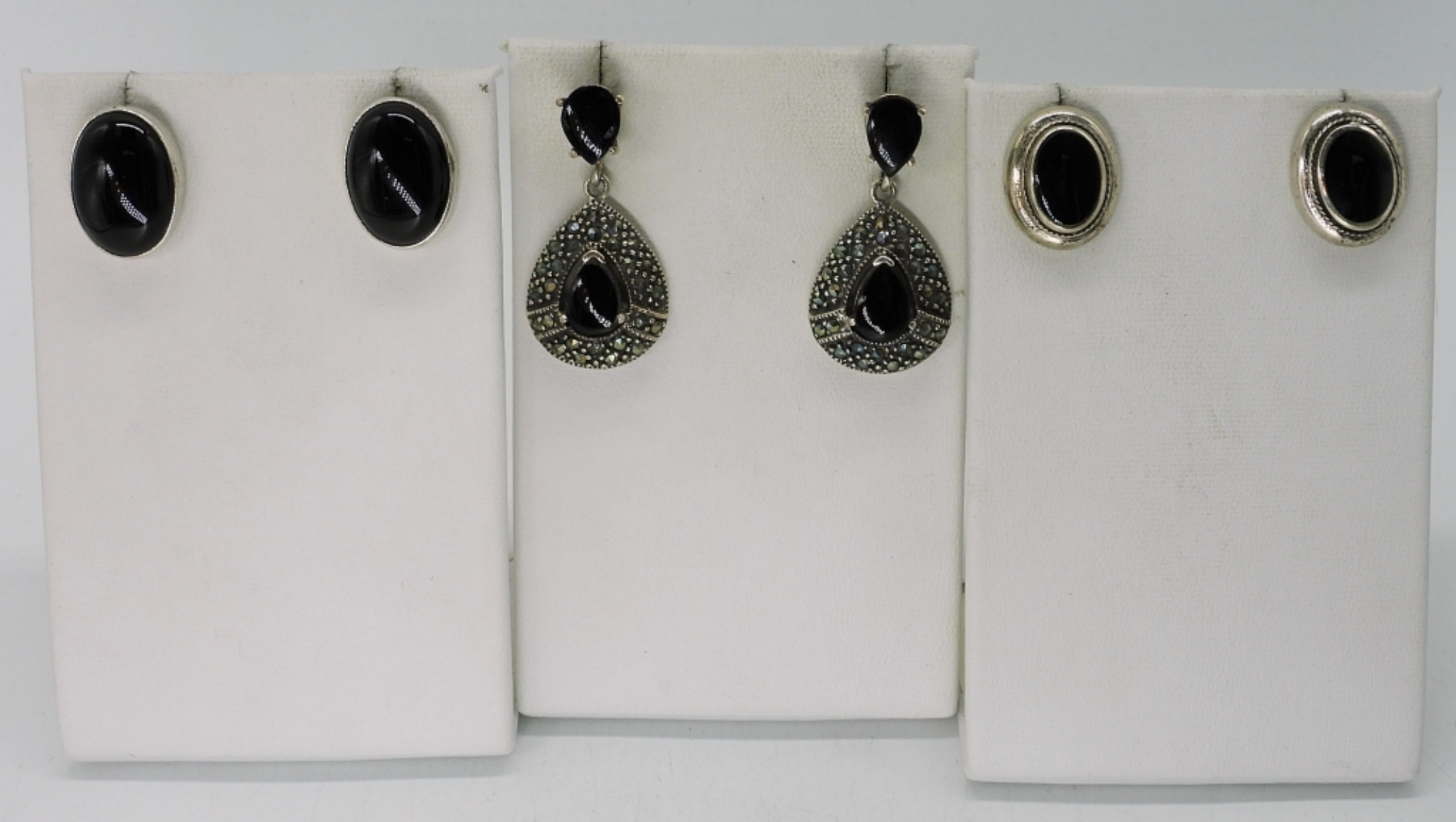 3 PAIR OF VINTAGE STERLING, BLACK GEMSTONE PIERCED EARRINGS. 15.7 DWT