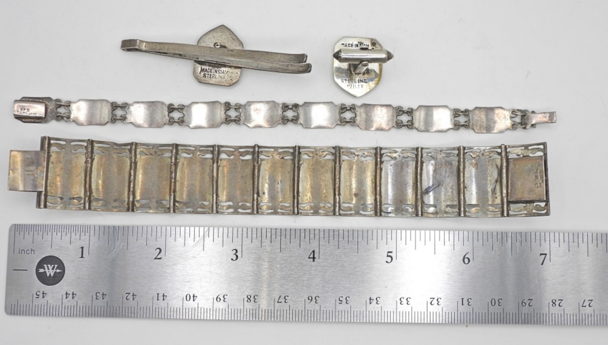 4 PIECES OF VINTAGE SIAM STERLING SILVER. 2 BRACELETS, 1 CUFF LINK AND 1 HAIR PIN 29.4 DWT